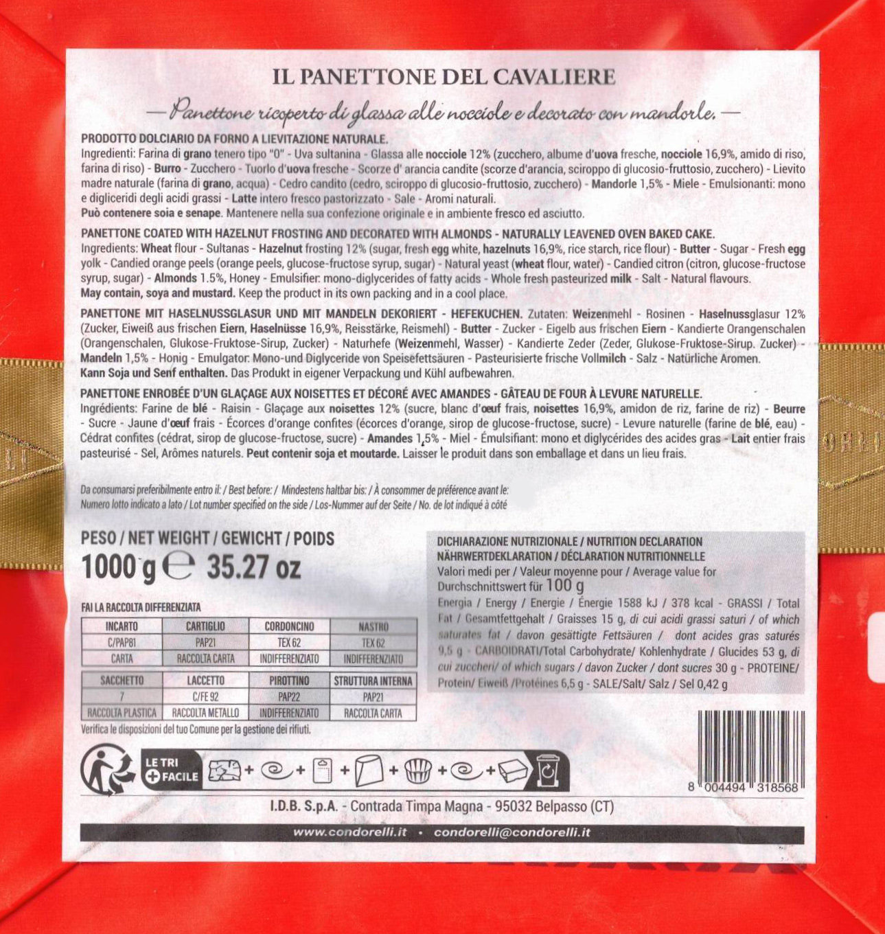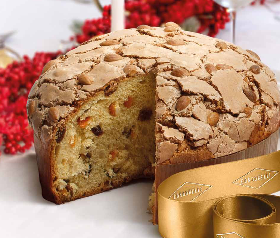 Ingredienti: Farina di grano tenero tipo “O” – Uva sultanina – Glassa alle nocciole 12% (zucchero, albume d’uova fresche, nocciole 16,9%, amido di riso, farina di riso) – Burro – Zucchero – Tuorlo d’uova fresche – Scorze d’arancia candite (scorze d’arancia, sciroppo di glucosio-fruttosio, zucchero) – Lievito madre naturale (farina di grano, acqua) – Cedro candito (cedro, sciroppo di glucosio-fruttosio, zucchero) – Mandorle 1,5% – Miele – Emulsionanti: mono e digliceridi degli acidi grassi – Latte intero fresco pastorizzato – Sale – Aromi naturali.