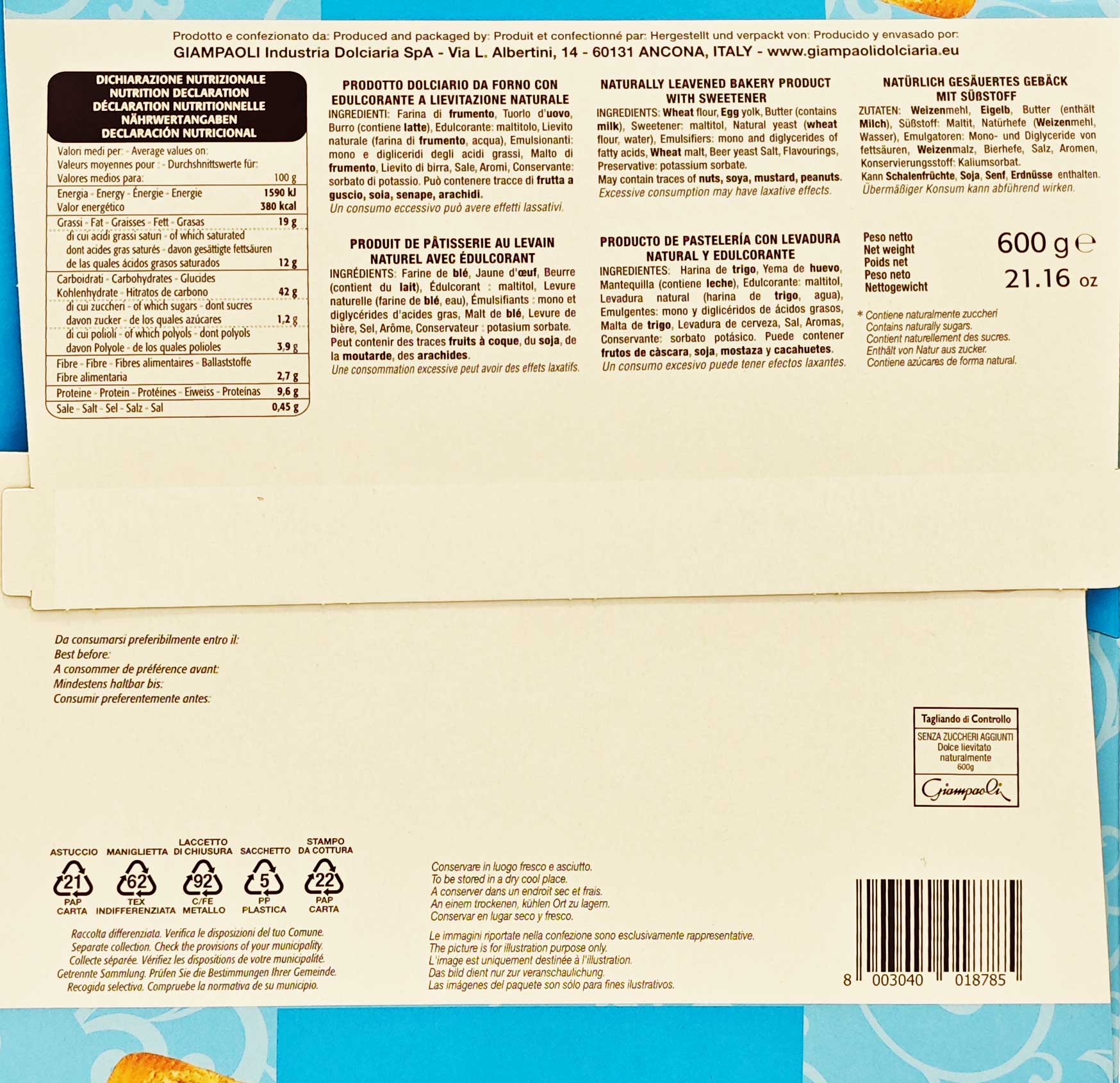 Farina di frumento, Tuorlo d’uovo, Burro (contiene latte), Edulcorante: maltitolo, Lievito naturale (farina di frumento, acqua), Emulsionanti: mono e digliceridi degli acidi grassi, Malto di frumento, Lievito di birra, Sale, Aromi, Conservante: sorbato di potassio.