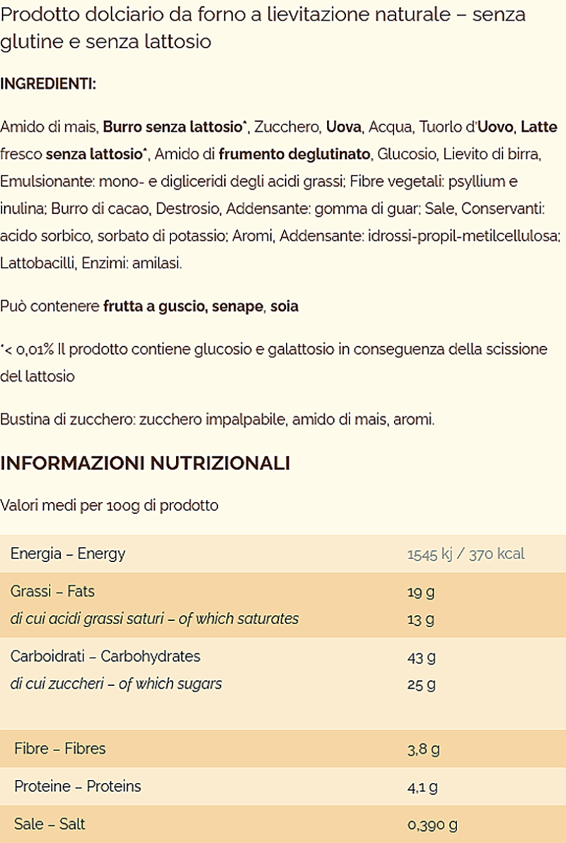 Lievito naturale (acqua, amido di frumento deglutinato, amido di mais, LATTE scremato in polvere, zucchero a velo, fibre vegetali (psyllium e inulina), addensanti: guar, idrossi-propil-metilcellulosa; aromi) amido di mais, zucchero, BURRO, UOVA, tuorlo d’UOVO, LATTE fresco, LATTE scremato in polvere, sciroppo di glucosio, lievito, zucchero a velo, emulsionante: mono e di-gliceridi degli acidi grassi, fibre vegetali (psyllium), addensante: guar, burro di cacao, sale, conservanti: acido sorbico, sorbato di potassio; enzimi (amilasi), aromi. Può contenere tracce di FRUTTA SECCA A GUSCIO. ALLERGENI: LATTE, UOVA.