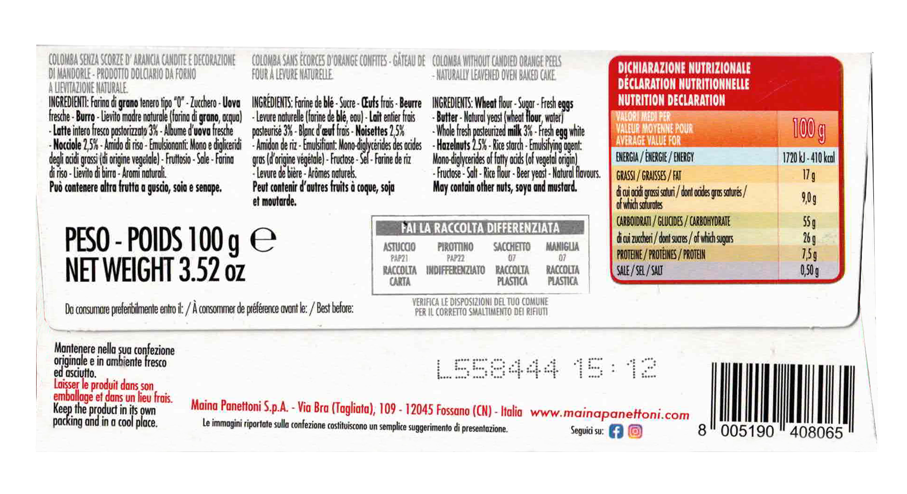 | Tipologia | Maina Mini Colomba Senza Canditi 100g, CAIYA Box con 6 confezioni |