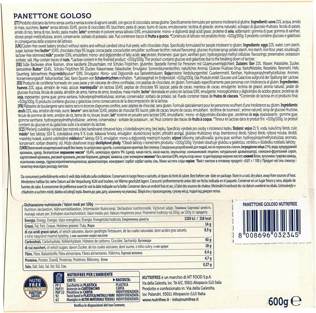 Scopri il Panettone Goloso Nutri Free, un delizioso dolce natalizio senza glutine e senza lattosio da 600g. Questo soffice panettone è arricchito con golose gocce di cioccolato e preparato con uova fresche, offrendo un’esperienza gustativa autentica e tradizionale. Specificamente formulato per le persone intolleranti al glutine, mantiene la consistenza morbida e il sapore ricco del panettone classico.