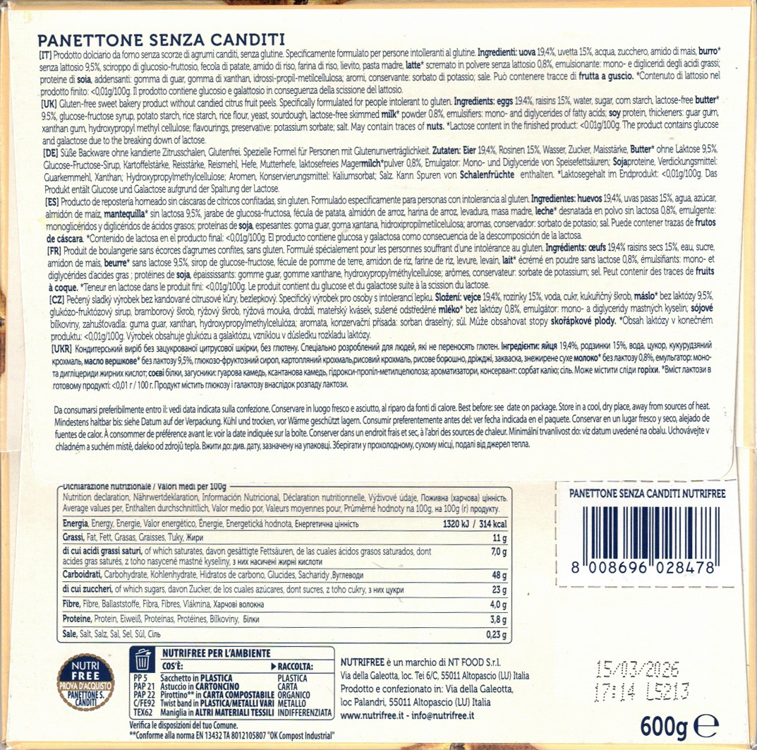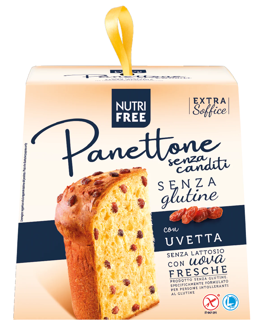 Uova 19,4%, uvetta 15%, acqua, zucchero, amido di mais, *burro senza lattosio 9,5%, sciroppo di glucosio-fruttosio, fecola di patate, amido di riso, farina di riso, lievito, pasta madre, *latte scremato in polvere senza lattosio 0,8%, emulsionante: mono- e digliceridi degli acidi grassi; proteine di soia, addensanti: gomma di guar, gomma di xanthan, idrossi-propil-metilcellulosa; aromi, conservante: sorbato di potassio; sale. Può contenere tracce di frutta a guscio.