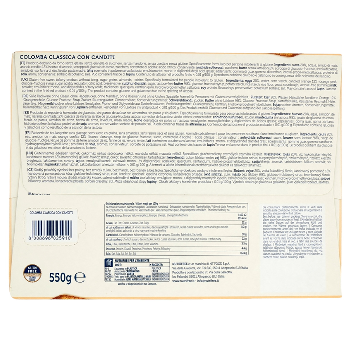 La Colomba Nutrifree con canditi è un dolce tradizionale italiano perfetto per chi segue una dieta senza glutine e senza lattosio. Questa deliziosa colomba da 550g presenta una texture extra soffice e un sapore autentico che non ha nulla da invidiare alle versioni tradizionali. Arricchita con canditi distribuiti uniformemente nell’impasto, ogni fetta offre un’esperienza gustativa ricca e soddisfacente!