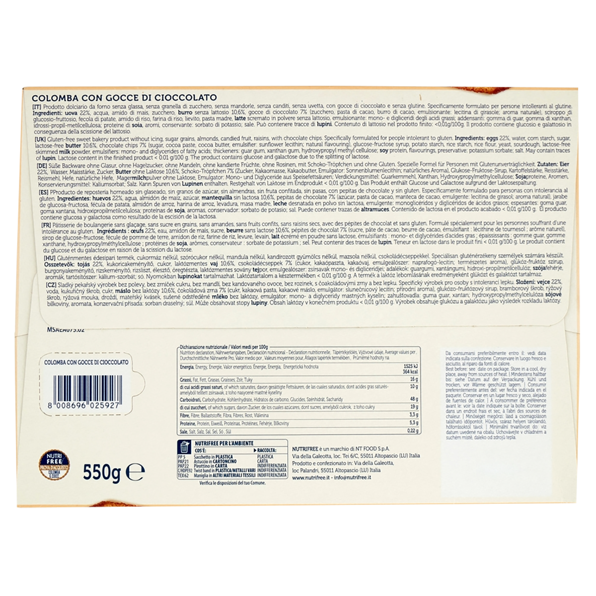 La Colomba Nutrifree con gocce di cioccolato è un dolce tradizionale italiano perfetto per chi segue una dieta senza glutine e senza lattosio. Questa deliziosa colomba da 550g presenta una texture extra soffice e un sapore autentico che non ha nulla da invidiare alle versioni tradizionali!