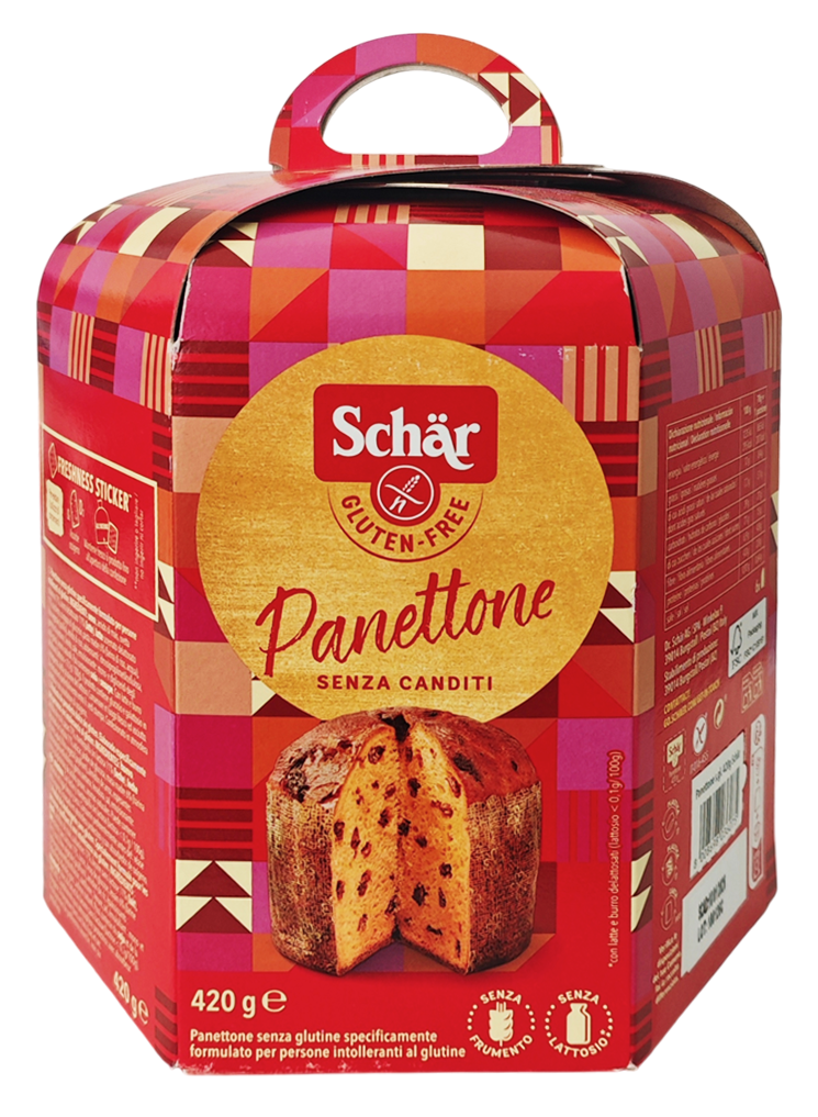 Scopri il delizioso Panettone Schar senza glutine, una vera delizia per le festività natalizie! Questo panettone da 420g è specificamente formulato per le persone intolleranti al glutine, offrendo tutto il sapore tradizionale senza compromessi. La versione ‘senza canditi’ è arricchita con uvetta succosa, perfetta per chi preferisce un gusto più delicato. Confezionato in un’elegante scatola decorativa dai motivi geometrici in rosso e oro, è ideale come regalo natalizio.