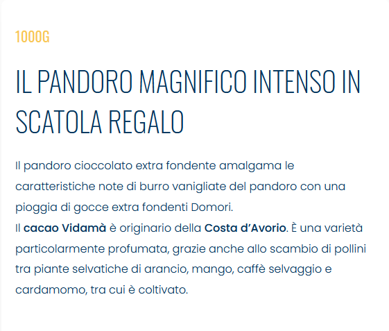 Scopri il Pandoro Magnifico Intenso, un dolce da 1000 g che unisce la sofficità tipica del pandoro con il sapore avvolgente di un cioccolato di altissima qualità.