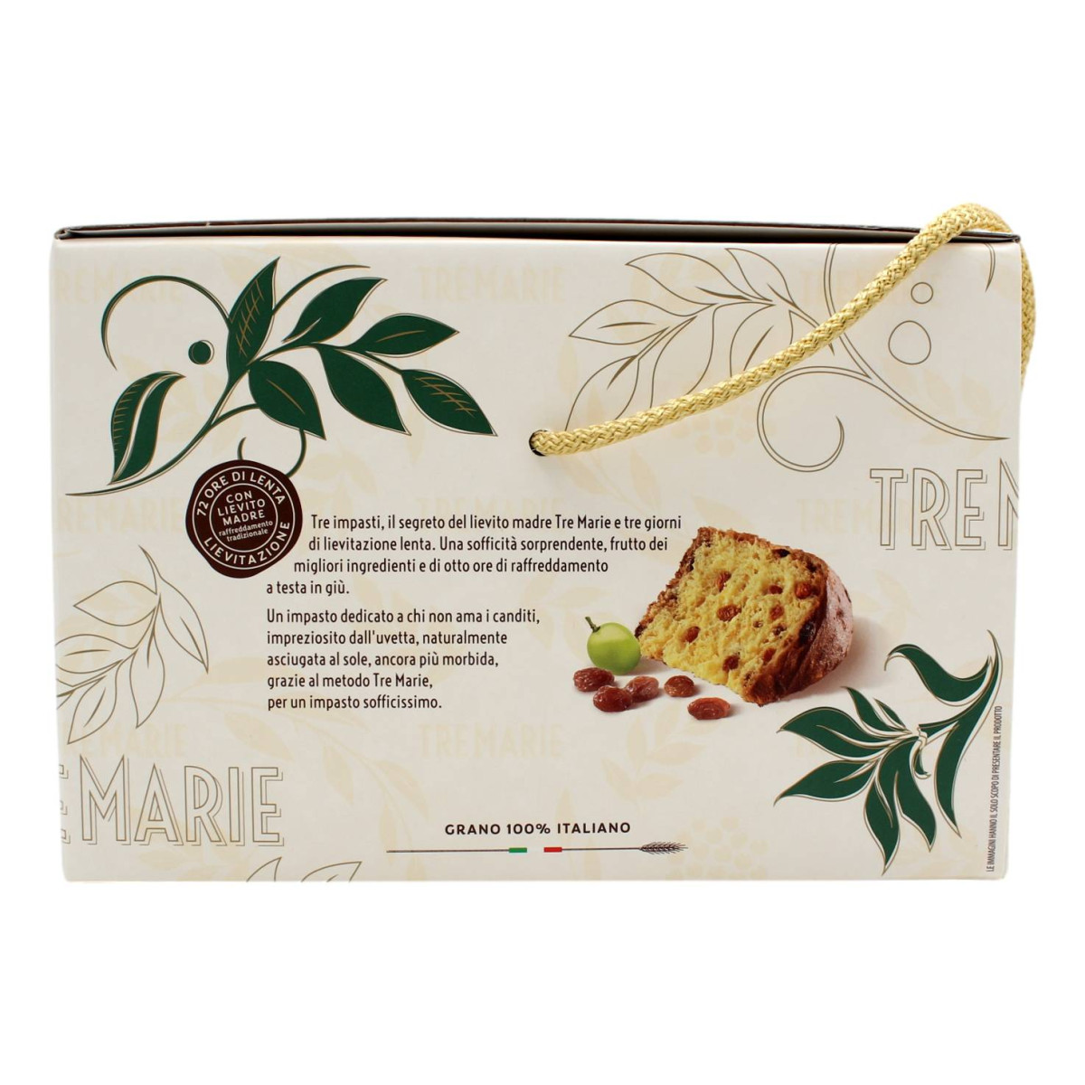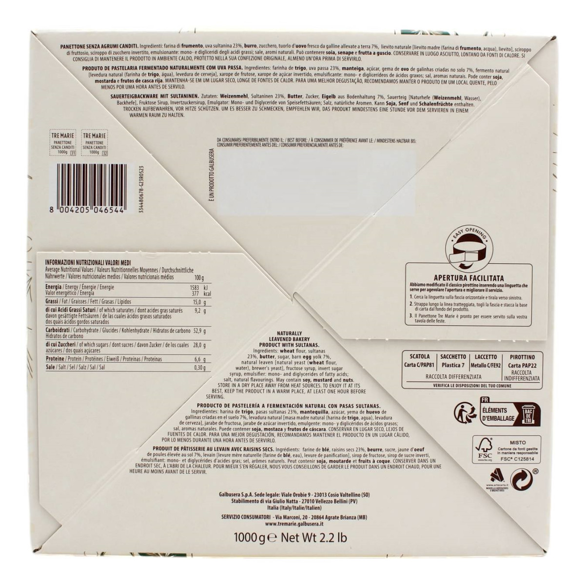 Ingredienti: Farina di frumento, uva sultanina 23%, burro, zucchero, tuorlo d’uovo fresco da galline allevate a terra 7%, lievito naturale [lievito madre (farina di frumento, acqua), lievito], sciroppo di fruttosio, sciroppo di zucchero invertito, emulsionante: mono- e digliceridi degli acidi grassi; sale, aromi naturali. Può contenere soia, senape e frutta a guscio.