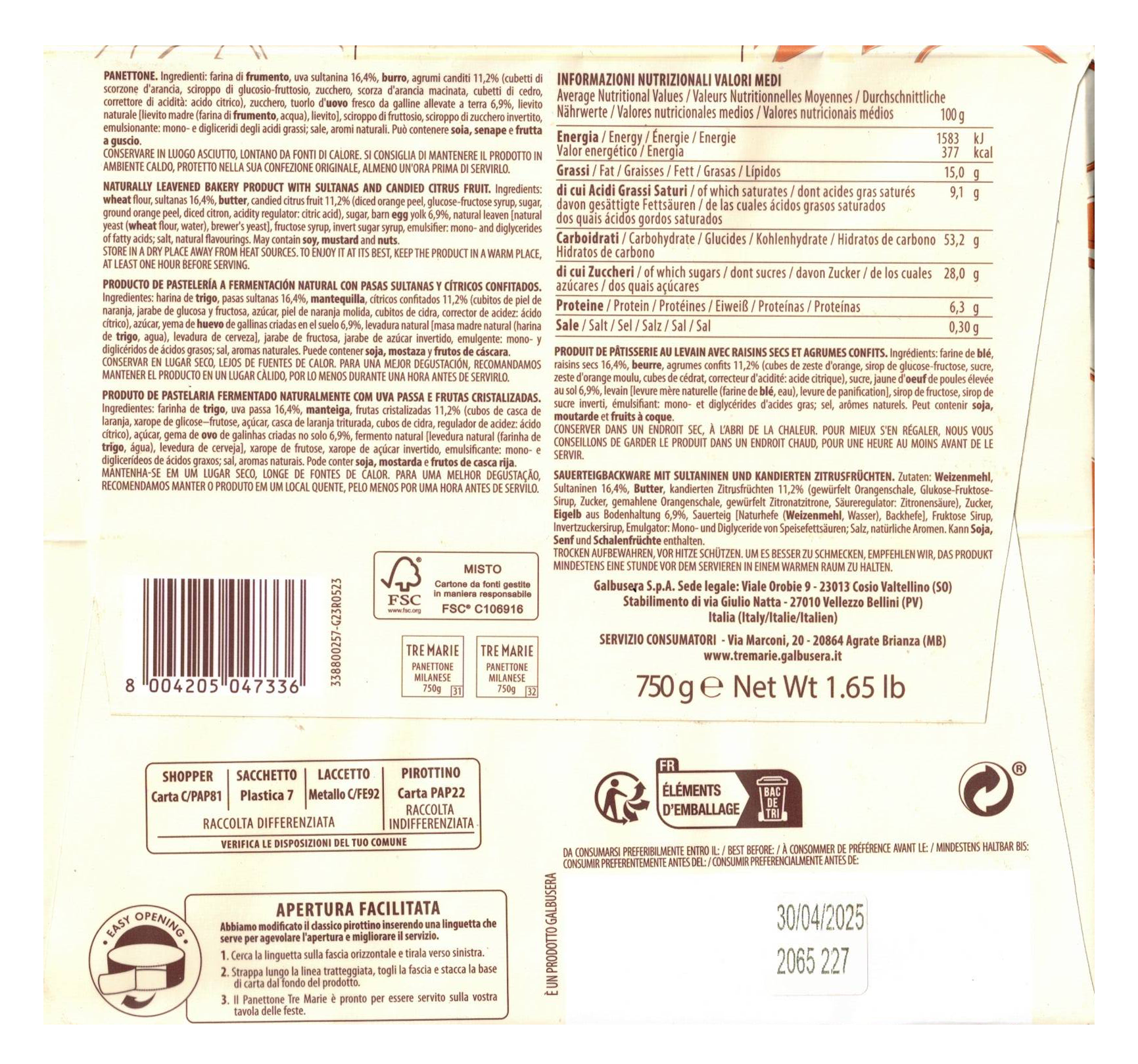 Uva sultanina 17,5%, farina di grano tenero macinata a pietra 17%, burro 12,5%, agrumi canditi 9,5% (cubetti di scorzone d’arancia, sciroppo di glucosio-fruttosio, zucchero, scorza d’arancia macinata, cubetti di cedro), farina di grano tenero, tuorlo d’uovo fresco, lievito naturale (frumento), zucchero, zucchero di canna 2,5%, farina integrale di grano tenero macinata a pietra 1%, farina di grano saraceno integrale 1%, sciroppo di fruttosio, sciroppo di zucchero invertito, emulsionante: mono- e digliceridi degli acidi grassi; siero di latte in polvere, sale, aromi naturali. Può contenere soia e frutta a guscio.