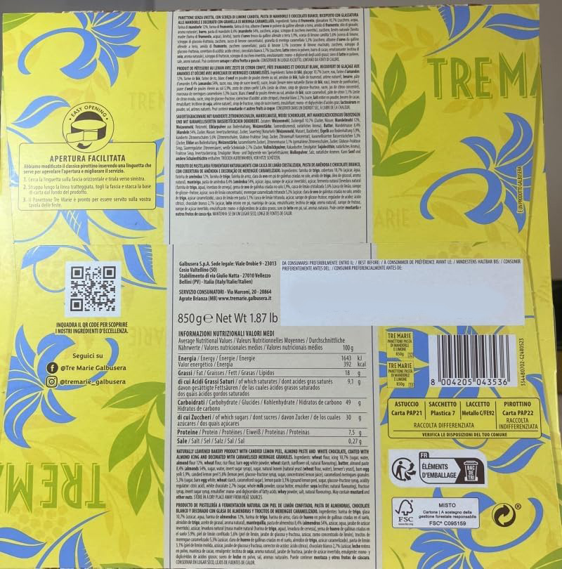Ingredienti: Farina di frumento, glassatura 10,7% (zucchero, acqua, farina di mandorle 12%, farina di frumento, farina di riso, albume d’uovo in polvere da galline allevate a terra, amido di frumento, olio di girasole, aroma naturale), burro, pasta di mandorle 8,4% (mandorle 54%, zucchero, acqua, sciroppo di zucchero invertito), zucchero, lievito naturale [lievito madre (farina di frumento, acqua), lievito], tuorlo d’uovo fresco da galline allevate a terra 5,9%, scorza di limone candita 5,6% (scorza di limone, sciroppo di glucosio-fruttosio, zucchero, succo di limone concentrato), granella di meringa caramellata 5,3% (zucchero, albume d’uovo da galline allevate a terra, amido di frumento, zucchero caramellato), pasta di limone 3,1% (scorzone di limone macinato, zucchero, sciroppo di glucosio-fruttosio, correttore di acidità: acido citrico), cioccolato bianco 2,7% (zucchero, latte intero in polvere, burro di cacao, emulsionante: lecitina di soia; aroma naturale), sciroppo di fruttosio, sciroppo di zucchero invertito, emulsionante: mono- e digliceridi degli acidi grassi; siero di latte in polvere, sale, aromi naturali.