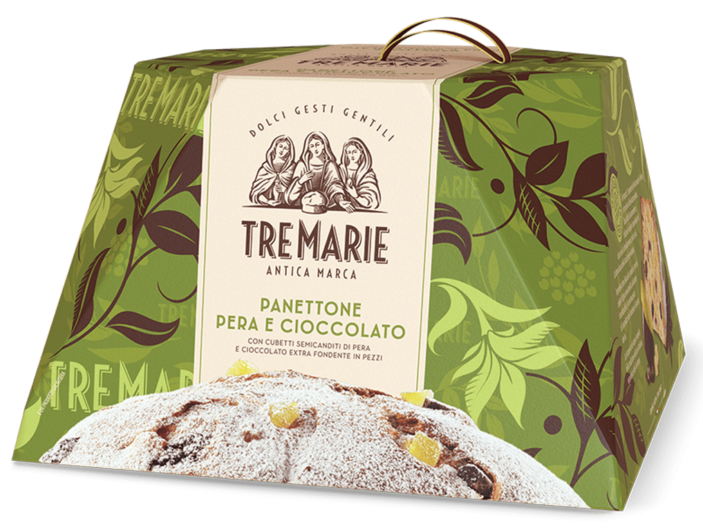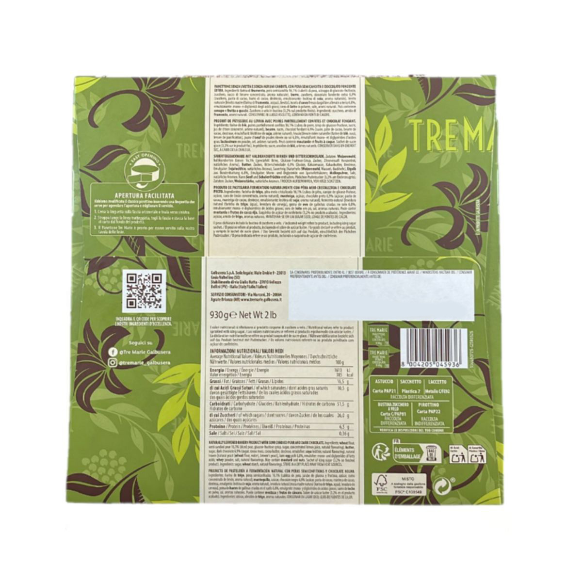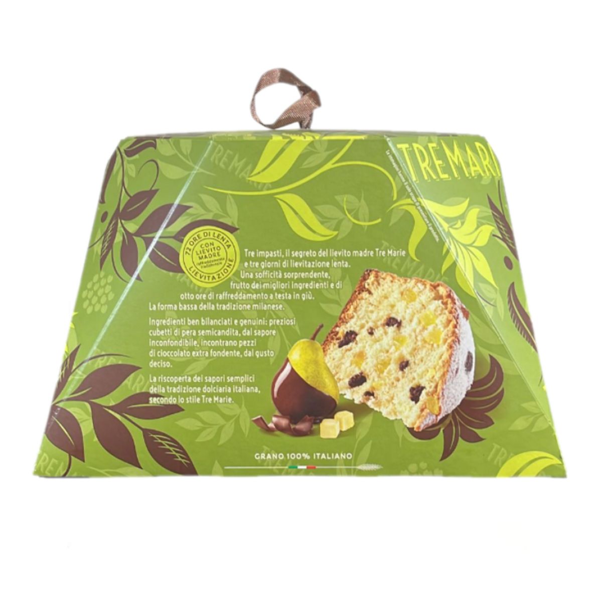 Ingredienti: Farina di frumento, pera semicandita 16,1% (cubetti di pera, sciroppo di glucosio-fruttosio, zucchero, succo di limone concentrato, aroma naturale), burro, zucchero, cioccolato fondente extra 6,9% (zucchero, pasta di cacao, burro di cacao, destrosio, emulsionante: lecitina di soia; aroma naturale), lievito naturale [levito madre (farina di frumento, acqua), lievito], tuorlo d’uovo fresco da galline allevate a terra 6,8%, emulsionante: mono- e digliceridi degli acidi grassi; siero di latte in polvere, sale, aromi naturali. Può contenere senape e frutta a guscio.