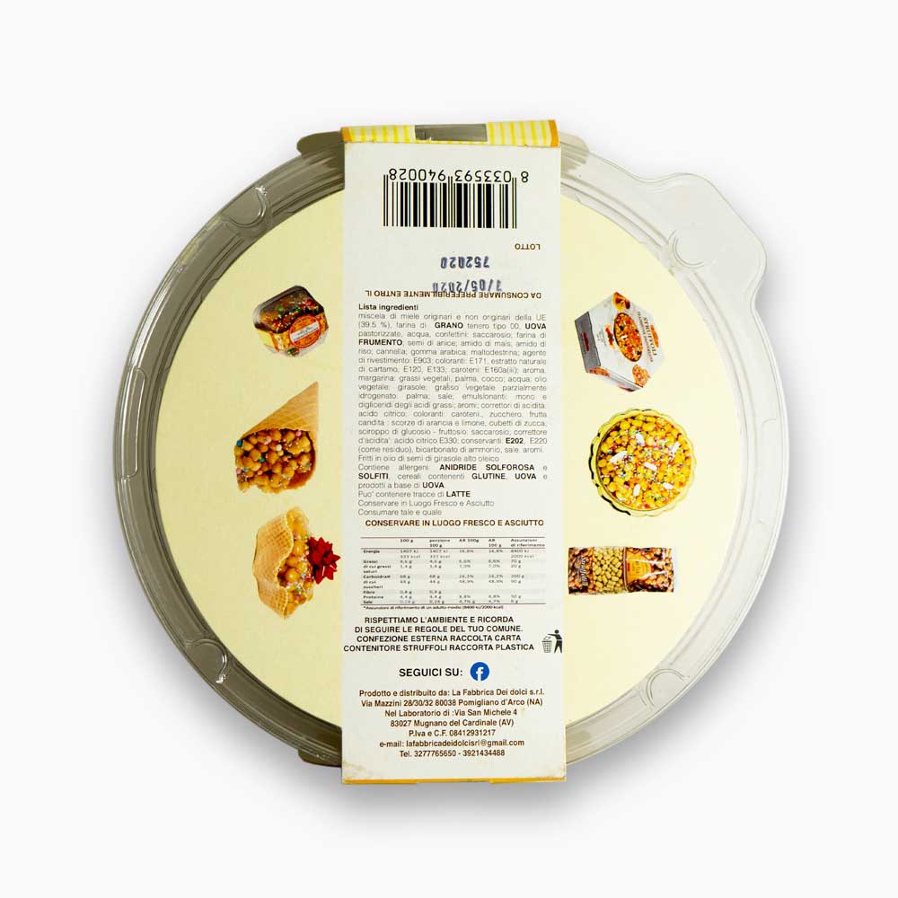 miscela di miele originari e non originari della UE (38,3 %), farina di GRANO tenero tipo 00, zucchero, UOVA pastorizzate, margarina (grasso di palma, acqua, olio di girasole, emulsionanti:(mono-e digliceridi degli acidi grassi, lecitina), sale da cucina (0,1%), acidificante: acido citrico, aroma, colorante: carotene.), olio di semi di girasole alto oleico, confettini: saccarosio; farina di FRUMENTO; amido di mais; amido di riso, gomma arabica; maltodestrina; agente di rivestimento: E903; , Coloranti: E120, E133; E160a(iii);, frutta candita : scorze di arancia e limone, cubetti di zucca; sciroppo di glucosio – fruttosio; saccarosio; correttore d’acidita’: acido citrico E330; conservanti: ANIDRIDE SOLFOROSA E202, E220 (come residuo), Agenti lievitanti: Carbonati di ammonio, sale, aromi, Vanillina. Contiene allergeni: ANIDRIDE SOLFOROSA e SOLFITI, Cereali contenenti GLUTINE, UOVA e prodotti a base di UOVA. Può contenere tracce di LATTE, SENAPE, SOIA, LUPINO, ARACHIDI.