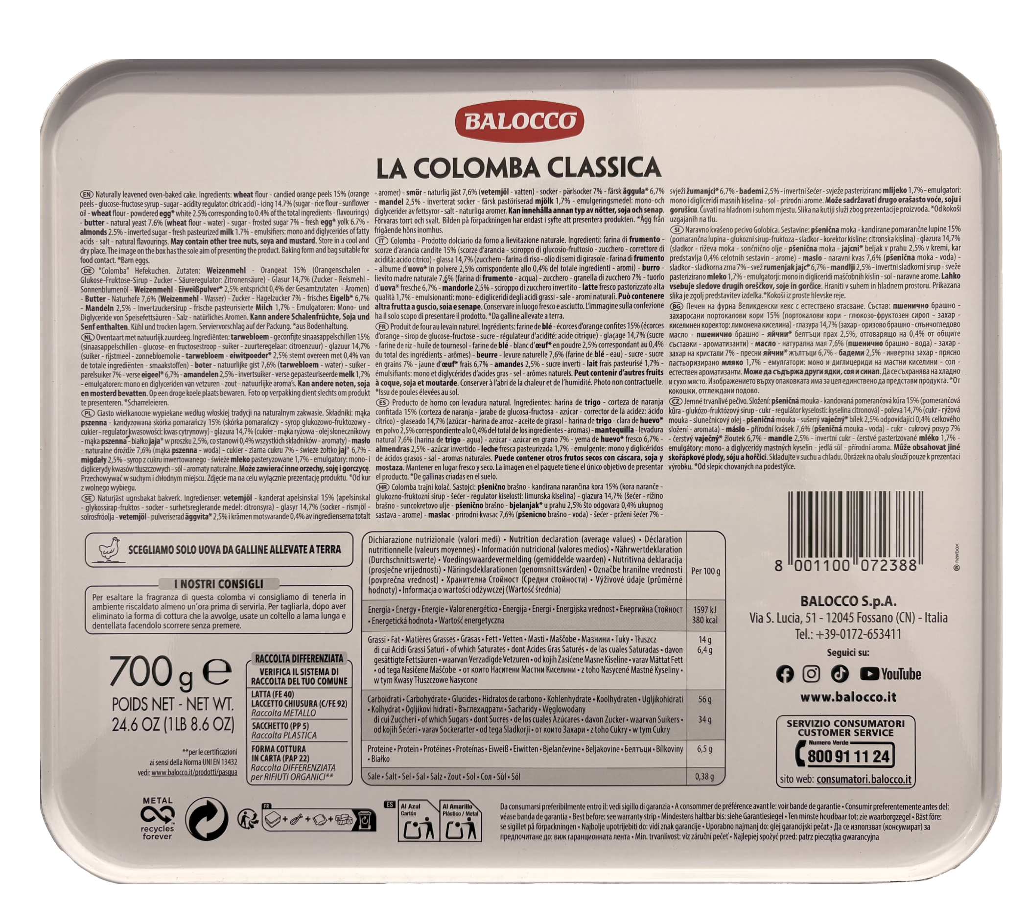 Colomba classica Balocco da 700g in elegante latta decorata riutilizzabile. Dolce pasquale tradizionale con arancia candita e glassa alle mandorle. Disponibile in 2 grafiche assortite (1 spedita secondo disponibilità).