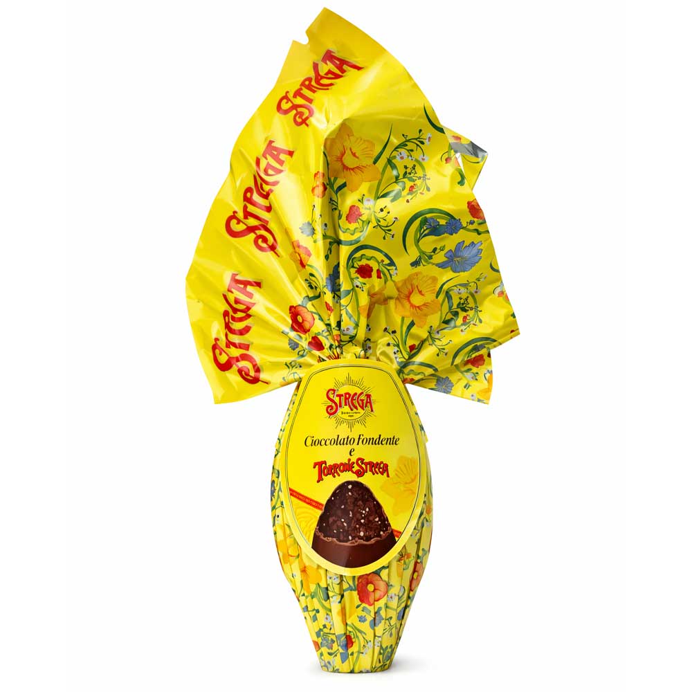Uovo di Pasqua Strega Alberti da 300g in cioccolato fondente (56% cacao minimo) con granella di torrone croccante e sorpresa inclusa. Confezione elegante e prodotto senza glutine, ideale come regalo pasquale.