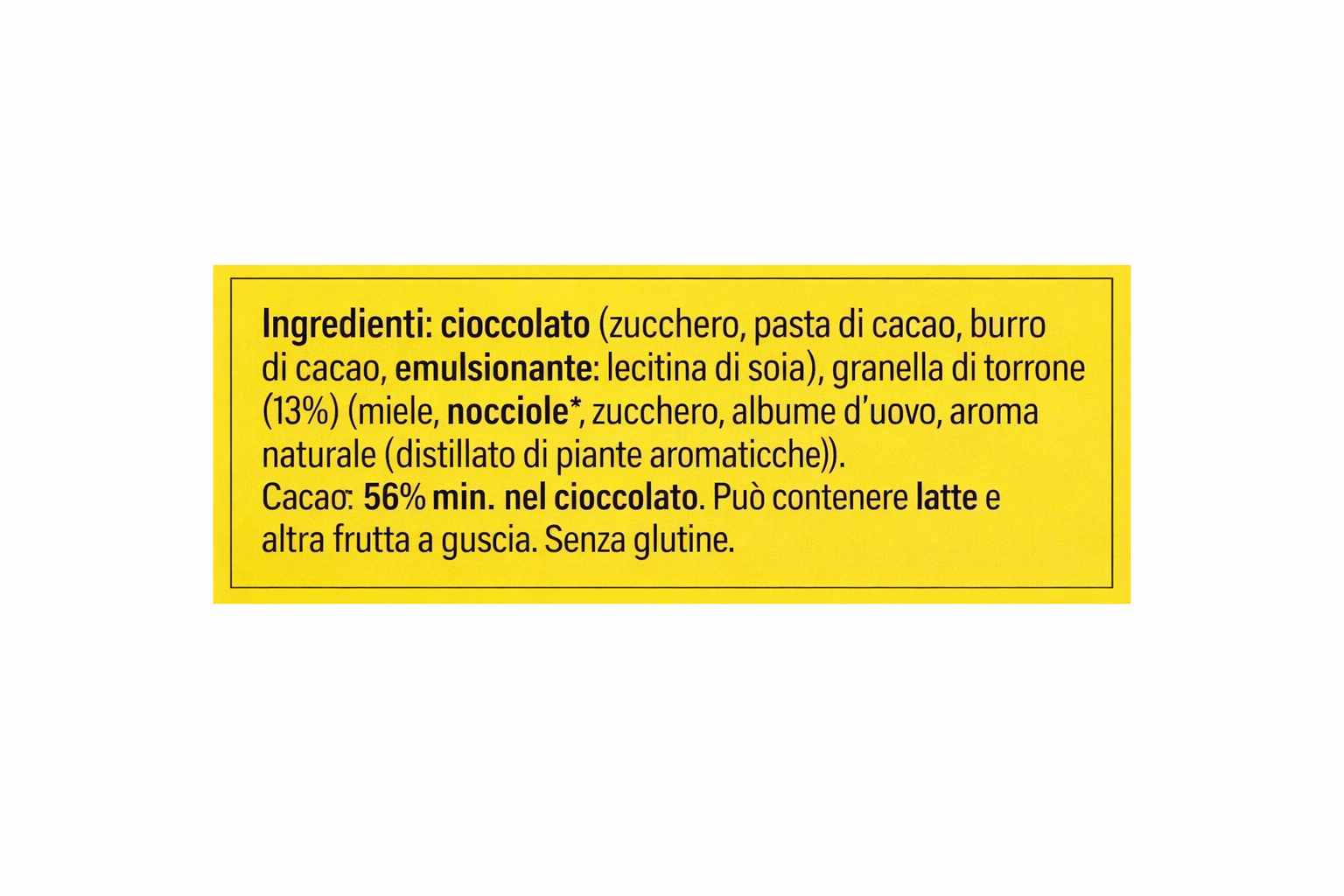 Cioccolato (zucchero, pasta di cacao, burro di cacao, emulsionante: lecitina di soja, aroma naturale), granella di torrone (13%) (miele, nocciole, zucchero, albumina d’uovo, aroma naturale (distillato di piante aromatiche)). Cacao: 51% minimo nel cioccolato. Può contenere latte e altra frutta a guscio. Senza glutine.