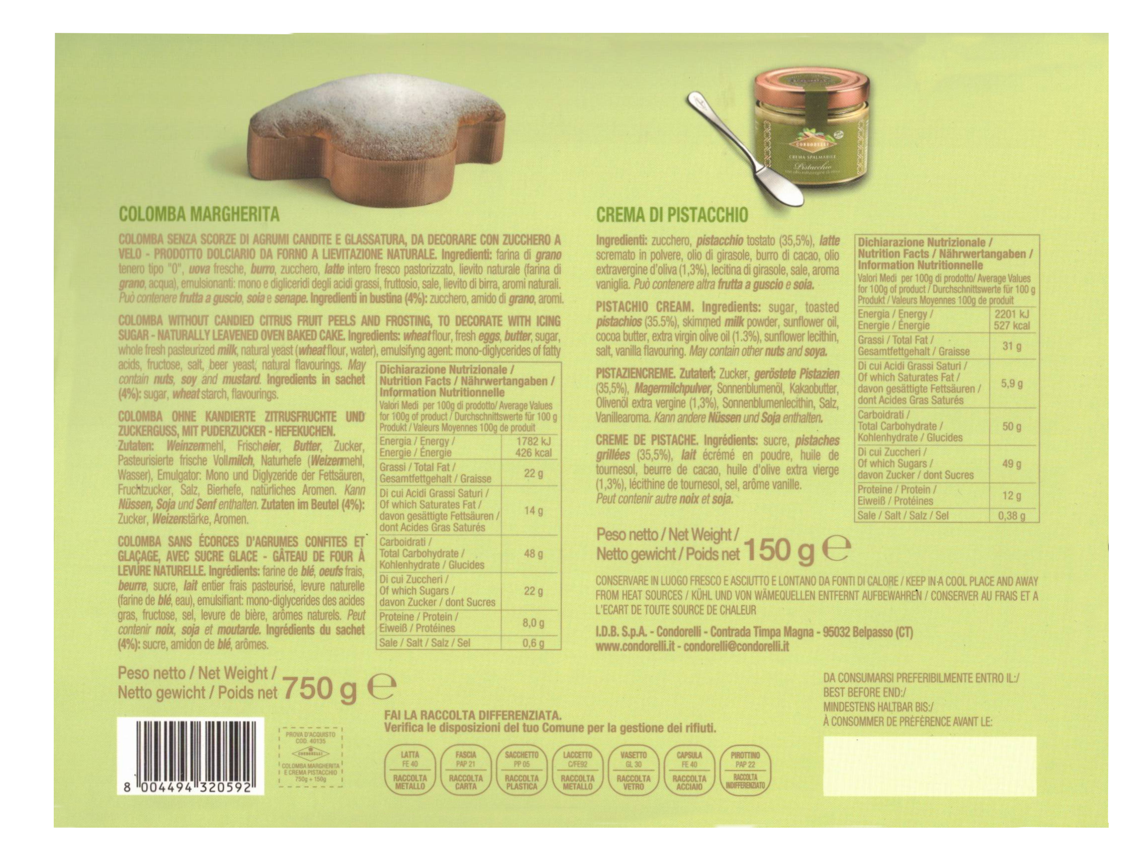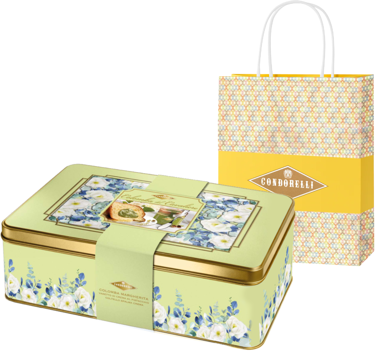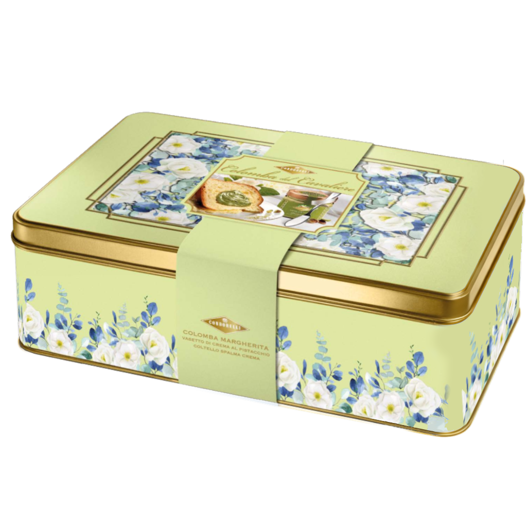 La Colomba Margherita Condorelli con crema al pistacchio è un’elegante proposta pasquale che unisce tradizione e gusto. La colomba soffice a lievitazione naturale è accompagnata da un vasetto di crema al pistacchio e da un coltello spalma crema per gustarla al meglio. Il tutto racchiuso in una raffinata scatola in latta decorata e completato da una busta regalo, perfetta per sorprendere durante le festività pasquali.