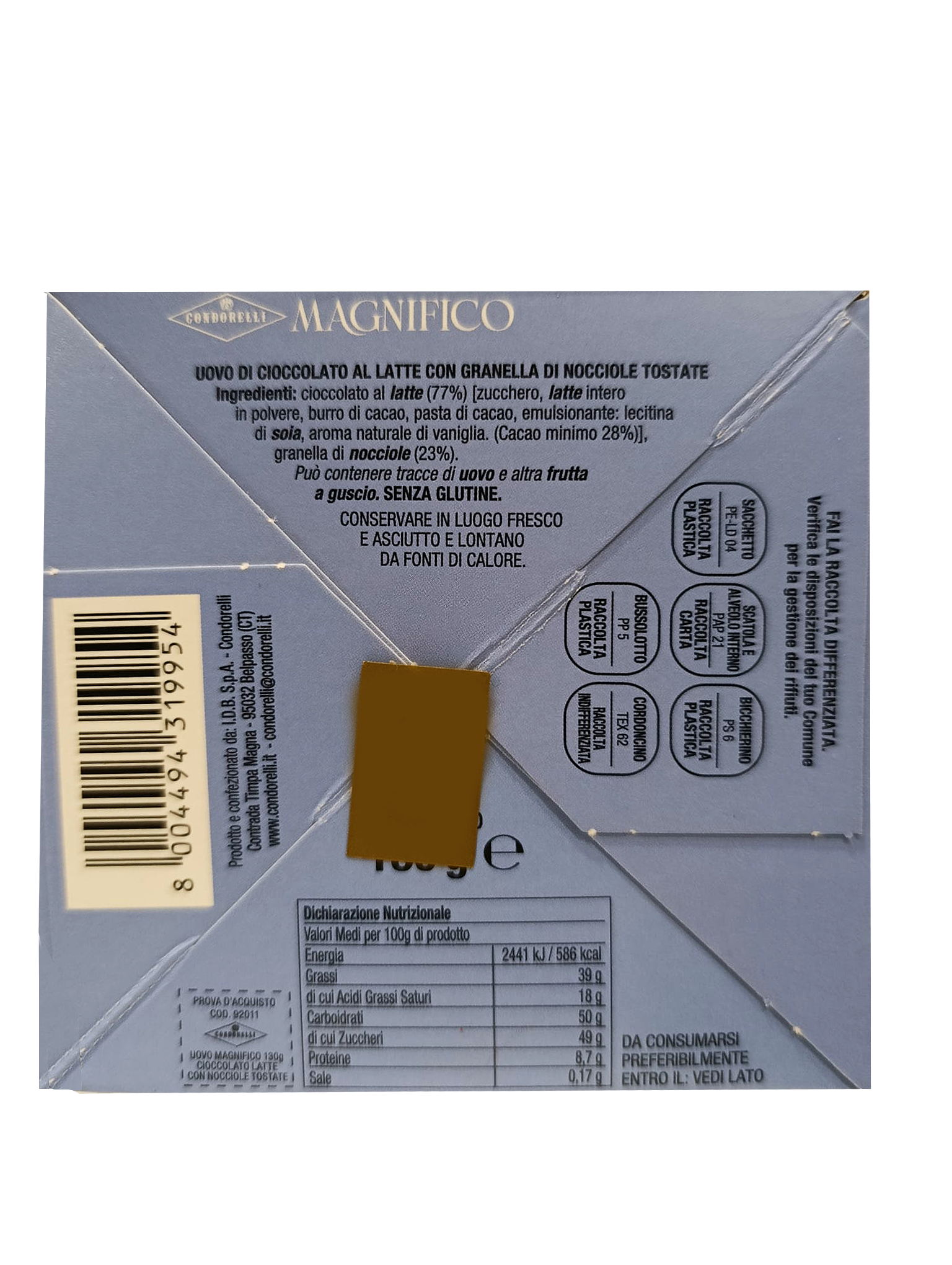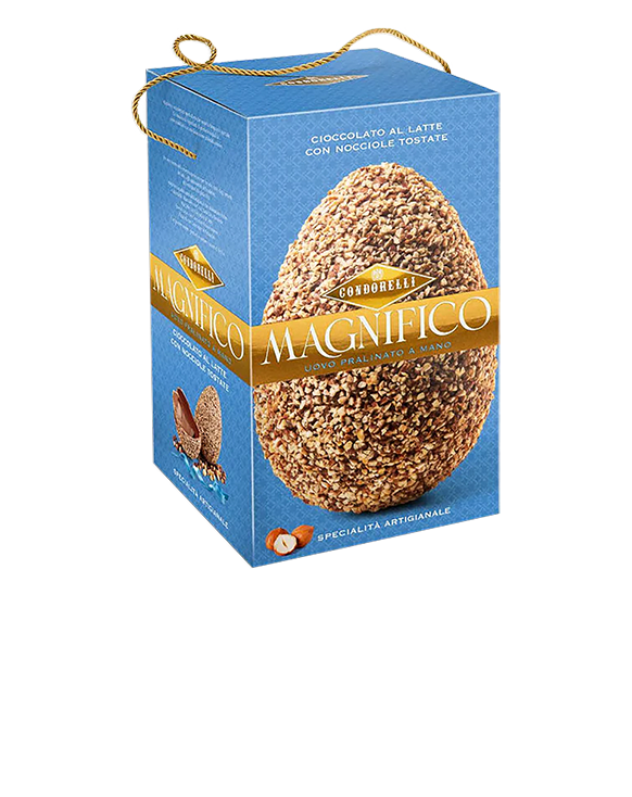 Il Condorelli Magnifico è un uovo di cioccolato al latte pralinato a mano ricoperto con croccante granella di nocciole tostate. Una specialità della tradizione dolciaria siciliana che unisce la cremosità del cioccolato al latte alla croccantezza della frutta secca, presentata in una elegante scatola azzurra ideale anche come idea regalo. Il formato da 130 grammi lo rende perfetto per concedersi un momento di dolcezza o per sorprendere chi ama il cioccolato di qualità.