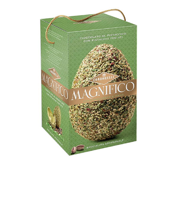 Il Condorelli Magnifico Uovo Pralinato al Pistacchio è una raffinata specialità dolciaria siciliana realizzata con cioccolato al pistacchio e ricoperta da una ricca granella di pistacchi tostati croccanti. Elegante nella sua confezione verde firmata Condorelli, rappresenta un dolce perfetto per Pasqua o un’idea regalo gourmet per gli amanti del pistacchio.
