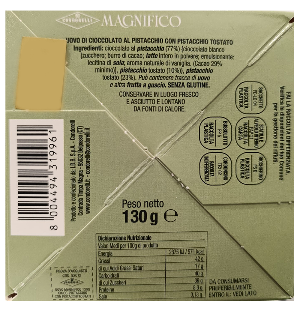 Il Condorelli Magnifico Uovo Pralinato al Pistacchio rappresenta una delle espressioni più golose della tradizione dolciaria siciliana. Questo elegante uovo di cioccolato è realizzato con cioccolato al pistacchio dal gusto cremoso e avvolgente ed è completamente ricoperto da una ricca pralinatura di pistacchi tostati che ne esalta il carattere e la croccantezza. Ogni morso regala un perfetto equilibrio tra la dolcezza del cioccolato e l’intensità aromatica del pistacchio, creando un’esperienza di gusto raffinata e irresistibile per tutti gli amanti di questo prezioso ingrediente. La superficie ricca di granella croccante dona una consistenza unica e rende questo prodotto non solo delizioso ma anche scenografico. Il prodotto è presentato in una raffinata scatola verde firmata Condorelli, elegante e curata nei dettagli, perfetta per trasformare questo uovo in un’idea regalo originale per Pasqua, festività o occasioni speciali. Condorelli è un marchio storico della Sicilia conosciuto per la qualità delle sue specialità dolciarie e per l’attenzione alla tradizione artigianale, valori che si riflettono in ogni creazione. Questo uovo pralinato al pistacchio è pensato per chi desidera gustare un dolce di alta qualità o sorprendere amici e familiari con un prodotto gourmet capace di unire eleganza, gusto intenso e tradizione.