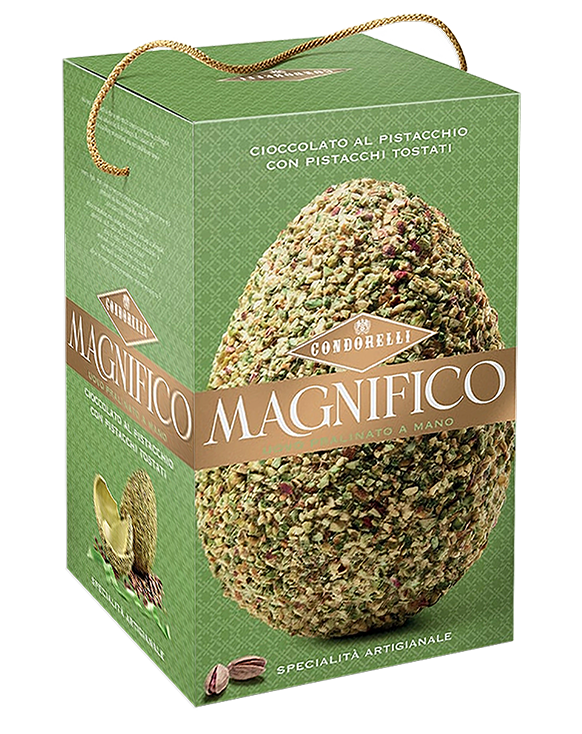 Scopri il lussuoso uovo di Pasqua Magnifico di Condorelli, un capolavoro artigianale di 440g che unisce il pregiato cioccolato al pistacchio con una generosa copertura di pistacchi tostati!