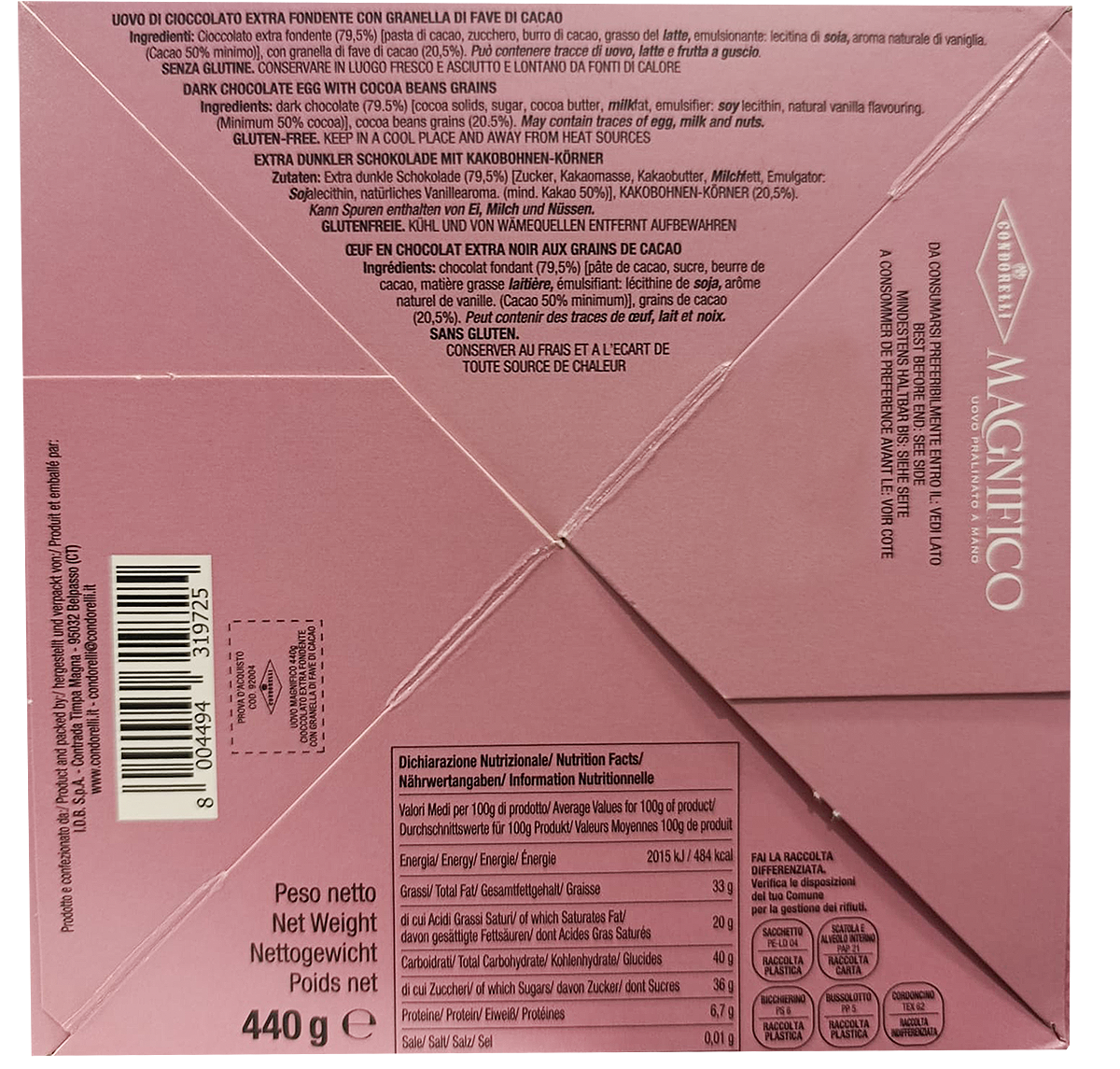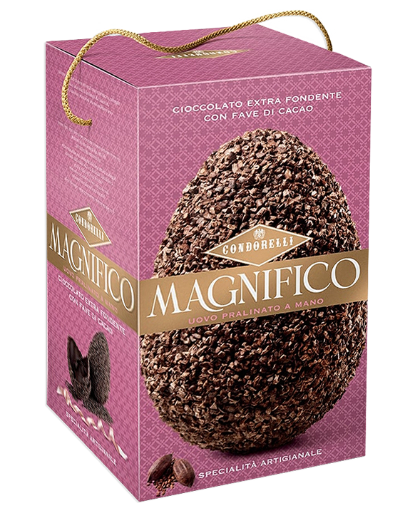 Condorelli Magnifico è un elegante uovo di Pasqua artigianale realizzato con cioccolato extra fondente e ricoperto da croccante granella di fave di cacao. Un perfetto equilibrio tra intensità aromatica e consistenza croccante che rende ogni assaggio un’esperienza unica. Ideale come regalo pasquale raffinato o da condividere con famiglia e amici durante le festività.