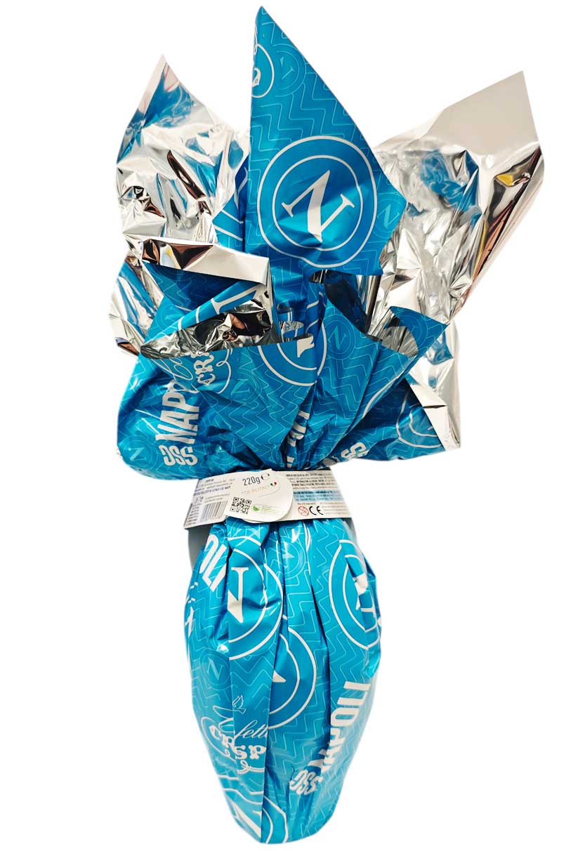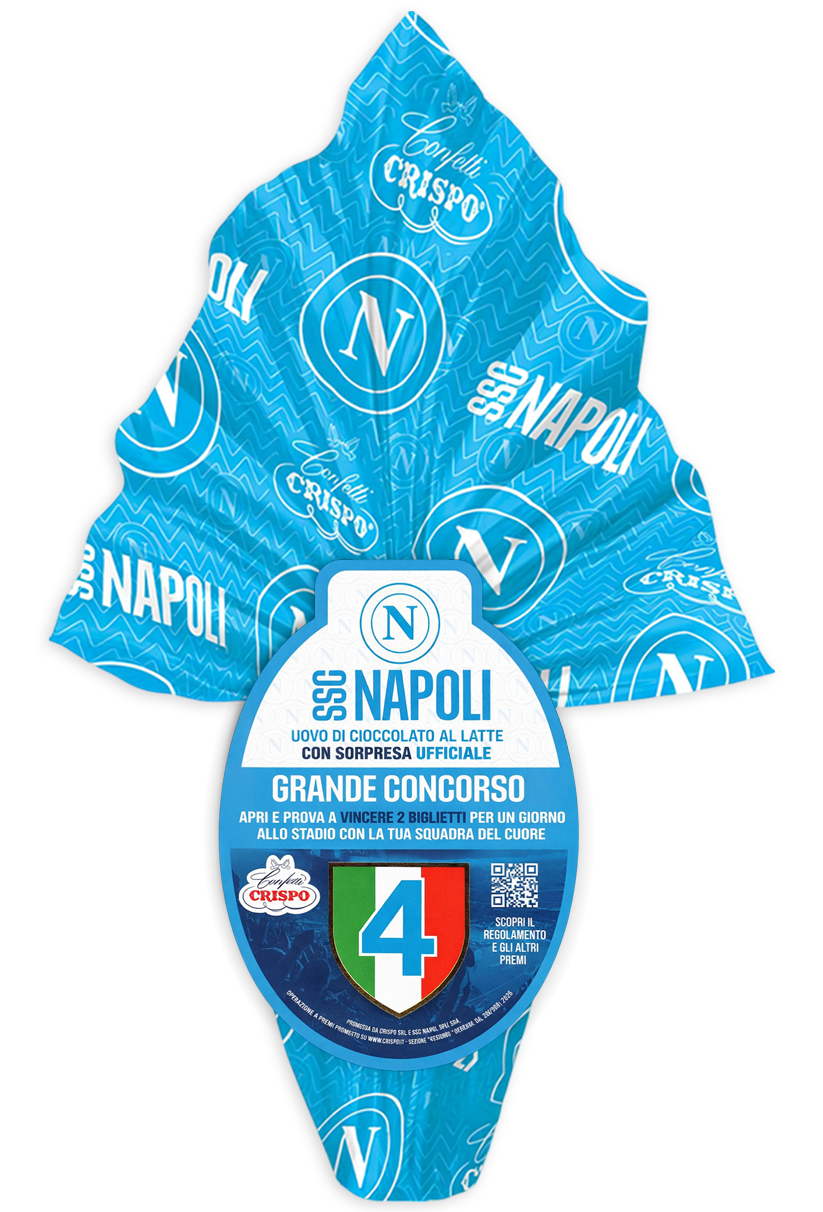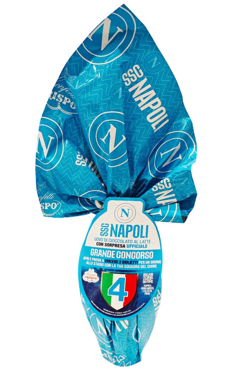 Uovo di Pasqua Crispo SSC Napoli 220g al cioccolato al latte con sorpresa ufficiale. Edizione speciale dedicata al Quarto Scudetto, perfetto come regalo per tifosi azzurri e collezionisti.