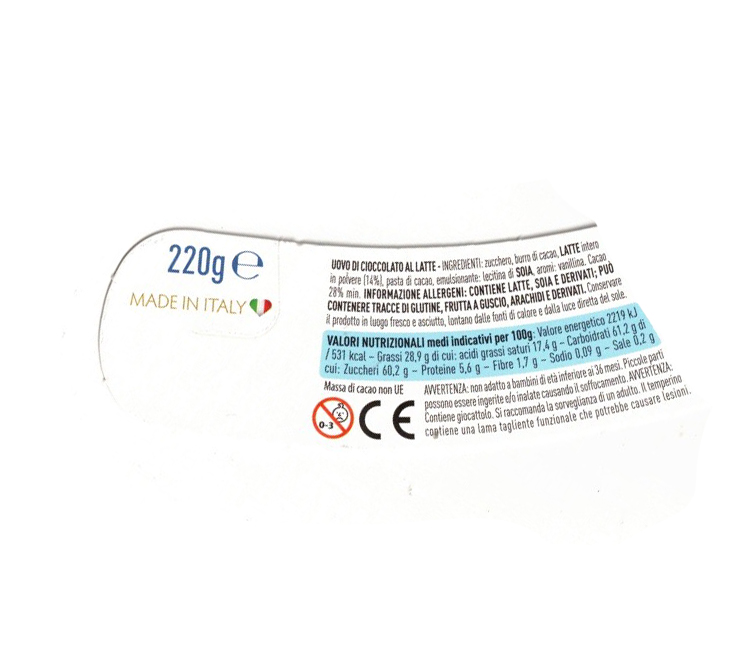 Cioccolato al LATTE (zucchero, burro di cacao, LATTE intero in polvere (14%), pasta di cacao, emulsionante: lecitina di SOIA, aromi: vanillina, cacao 28% min.