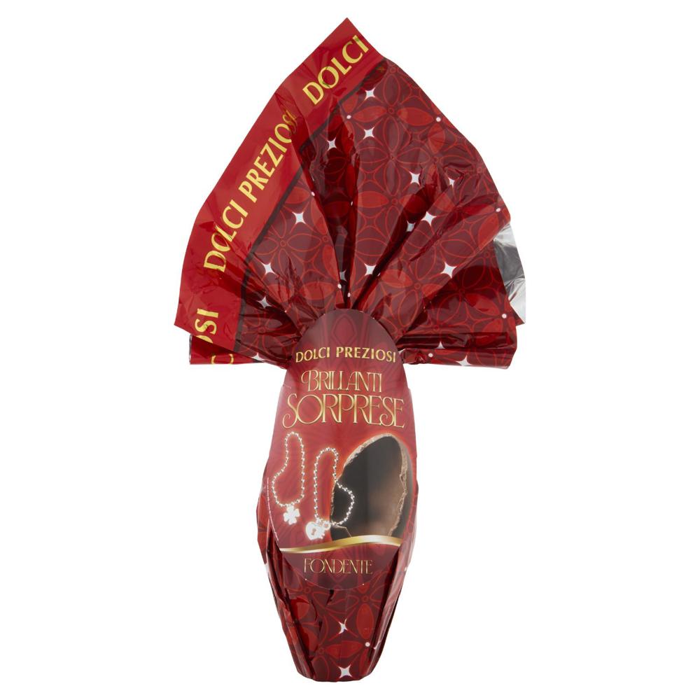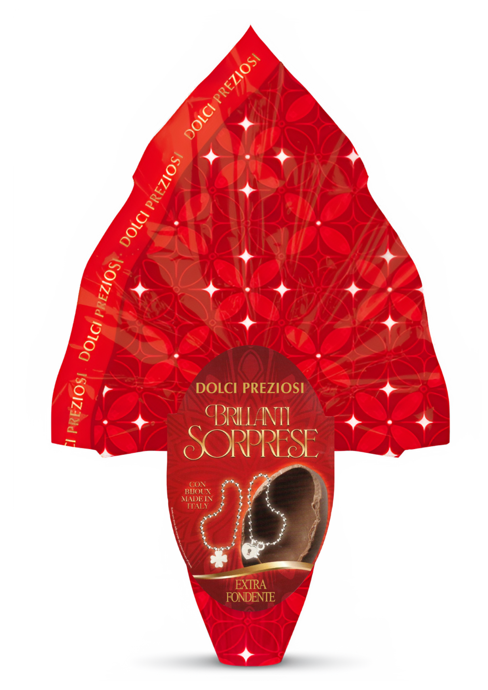Uovo di Pasqua Dolci Preziosi Brillanti Sorprese da 210g in cioccolato extra fondente con esclusivo bijoux Made in Italy all’interno. Un regalo elegante e raffinato che unisce gusto intenso e sorpresa glamour.