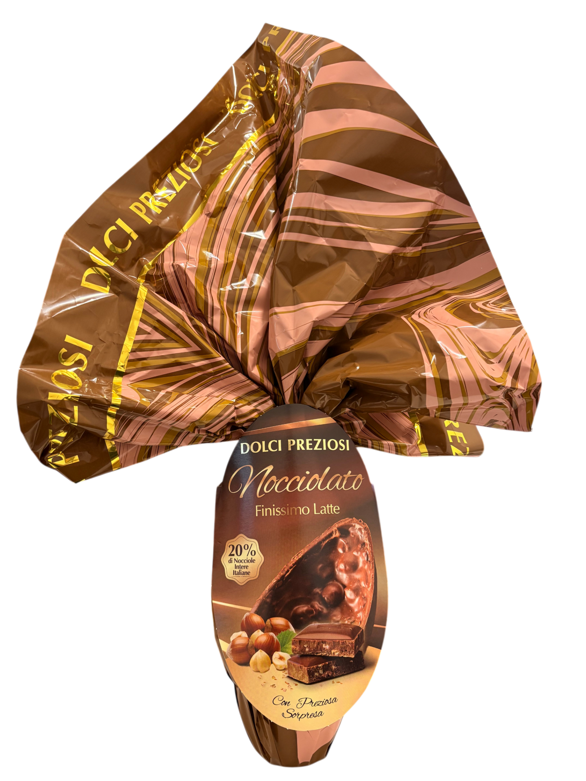 Uovo di Pasqua Dolci Preziosi al cioccolato finissimo al latte con nocciole tostate e sorpresa all’interno. Un grande classico pasquale che unisce la cremosità del cioccolato alla croccantezza delle nocciole, perfetto come regalo per bambini e adulti o da condividere durante le festività.