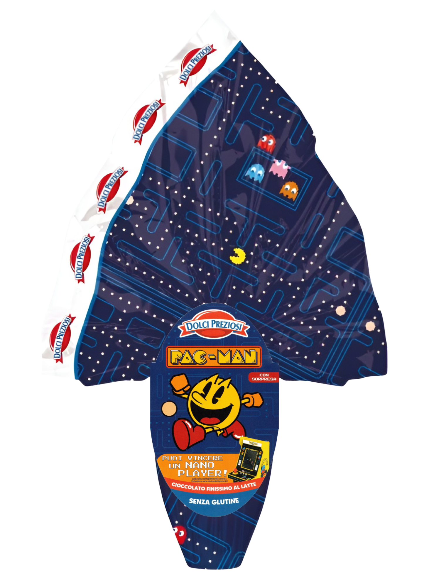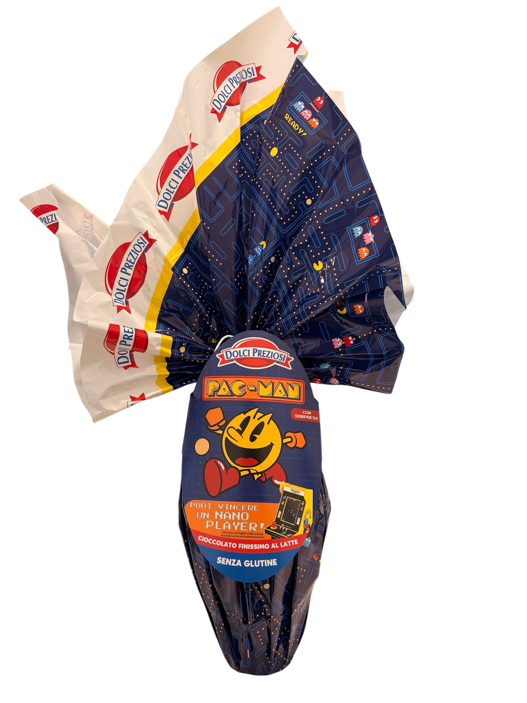 Uovo di Pasqua Pac-Man Dolci Preziosi da 320g con finissimo cioccolato al latte senza glutine e sorpresa tematica inclusa, perfetto come idea regalo pasquale.
