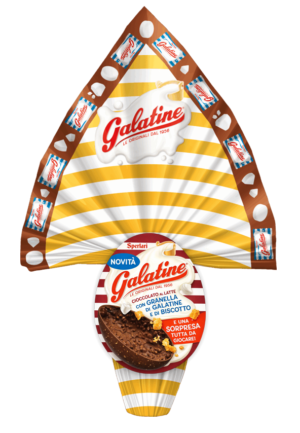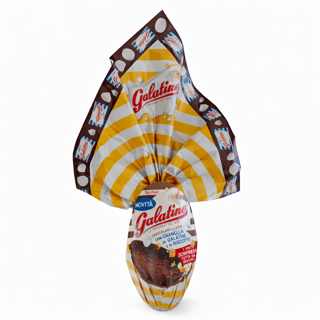 Uovo di Pasqua Galatine 230g al cioccolato al latte con granella croccante di Galatine e biscotto, completo di sorpresa. Un’alternativa originale e golosa al classico uovo pasquale, firmata Sperlari.