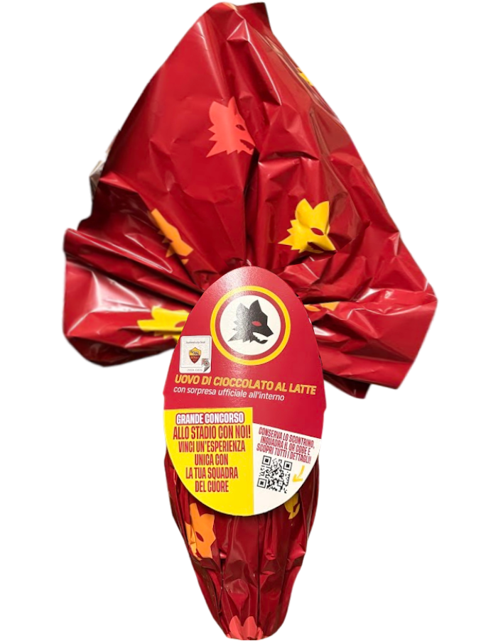 Celebra la Pasqua 2026 con questo esclusivo uovo di cioccolato al latte AS Roma da 180g! Avvolto in una splendida confezione bordeaux e oro con il caratteristico logo del lupo e un elegante motivo a strisce, questo uovo pasquale è un must-have per ogni tifoso giallorosso. All’interno troverai una sorpresa ufficiale dell’AS Roma che renderà ancora più speciale questa delizia. Partecipa anche al grande concorso ‘Allo stadio con noi!’ scansionando il QR code presente sulla confezione – potresti vincere un’esperienza unica con la tua squadra del cuore. Il cioccolato al latte di alta qualità si scioglie delicatamente in bocca, regalando un momento di puro piacere. Un regalo perfetto che unisce la passione per il calcio al gusto irresistibile del cioccolato, ideale per tutti i romanisti che vogliono festeggiare la Pasqua con i colori della loro squadra.