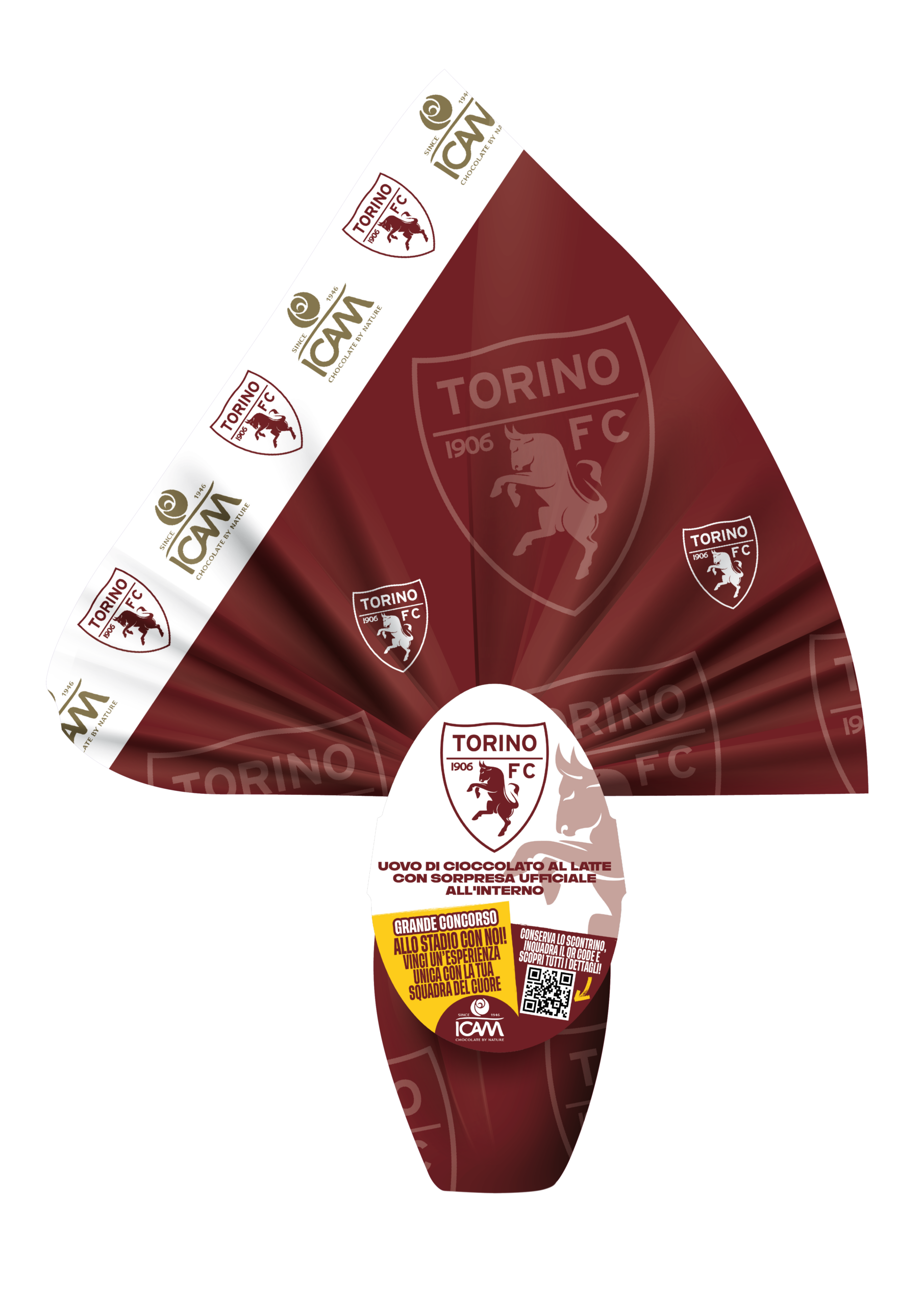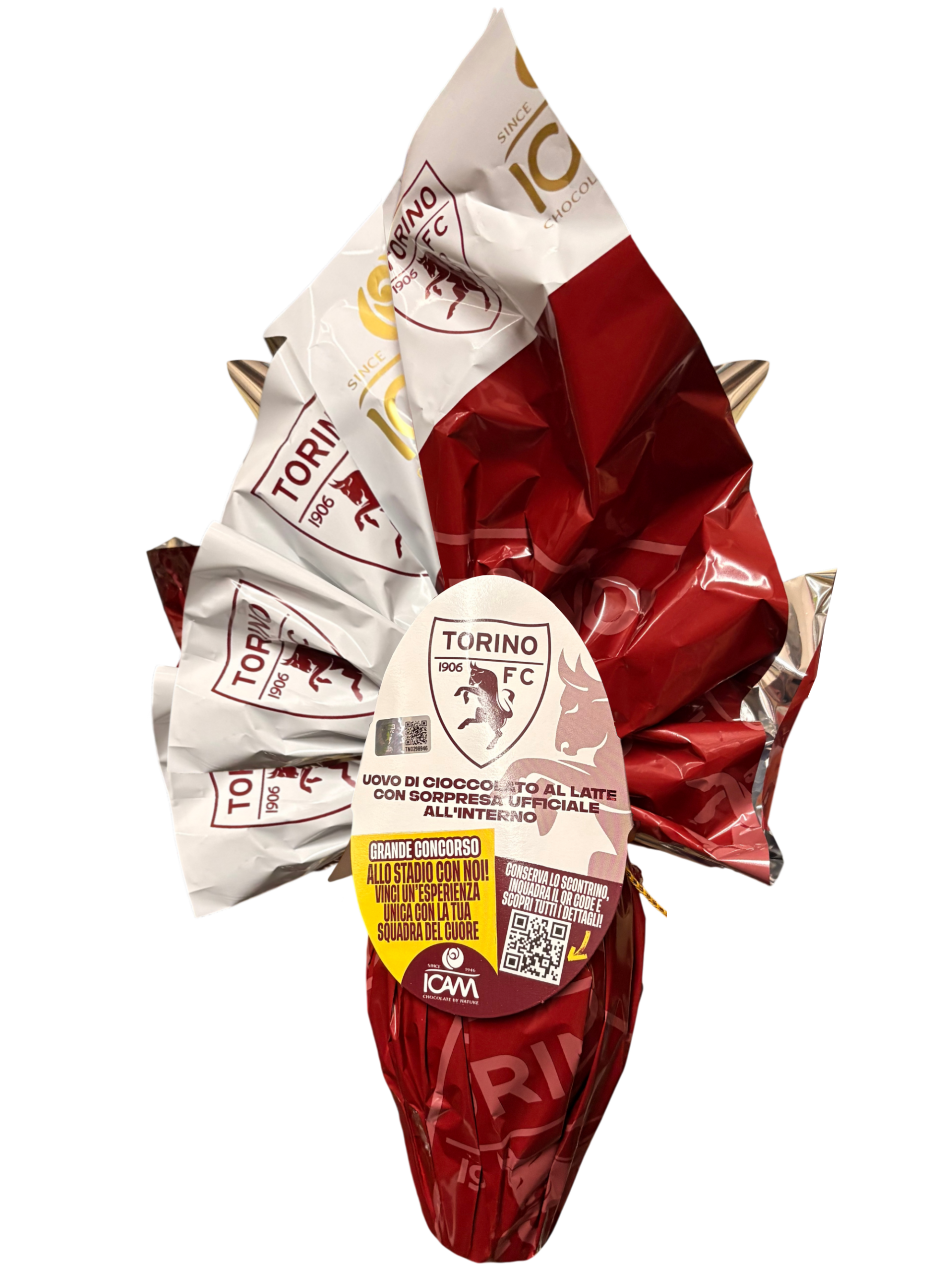 Scopri la magia del calcio con questo esclusivo uovo di cioccolato al latte Torino FC da 180g. Creato in collaborazione con il prestigioso club granata fondato nel 1906, questo delizioso uovo di Pasqua presenta l’iconico logo del toro rampante su un elegante sfondo bordeaux. All’interno troverai una sorpresa ufficiale del Torino FC che farà la gioia di ogni tifoso. Partecipa anche all’emozionante concorso inquadrando il QR code sull’uovo: potresti vincere un’esperienza indimenticabile allo stadio con la tua squadra del cuore! La confezione presenta un design accattivante con multipli loghi del club e una grafica dedicata che celebra la passione granata. Un regalo perfetto per i tifosi del Toro che vogliono celebrare la Pasqua 2026 con i colori della propria squadra.