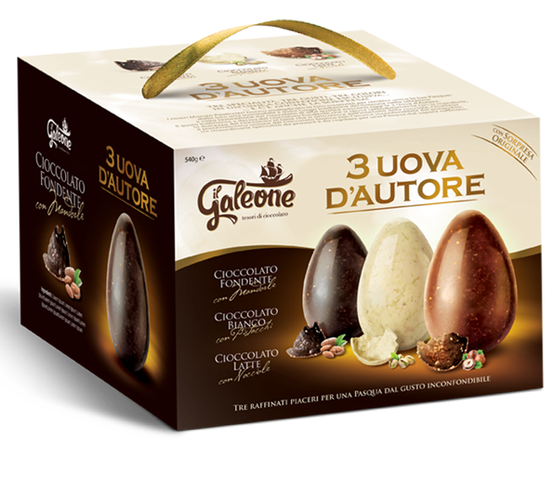 Scopri il lusso delle uova di Pasqua Il Galeone con questa elegante confezione da 540g che include tre raffinate varietà di cioccolato. Ogni uovo è un capolavoro di gusto: il cioccolato fondente con mandorle offre un’esperienza intensa e avvolgente, il cioccolato bianco delicato regala note vellutate e cremose, mentre il cioccolato al latte con nocciole completa perfettamente il trio con la sua dolcezza equilibrata. Ogni uovo nasconde una sorpresa speciale al suo interno, rendendo questo set ancora più prezioso. La confezione elegante rende questo prodotto perfetto come regalo raffinato o per arricchire le tue celebrazioni pasquali. Un’esperienza gastronomica che unisce la tradizione pasquale italiana alla più alta qualità del cioccolato artigianale, creando tre raffinati piaceri per una Pasqua dal gusto inconfondibile.