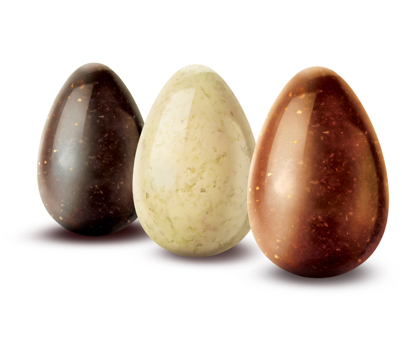 Uovo al cioccolato fondente alle mandorle: zucchero (47%), massa di cacao (45,5%), burro di cacao (7,2%), emulsionante: lecitina di soia (0,5%), aroma naturale di vaniglia (0,03%), mandorle (12%). Può contenere tracce di latte.