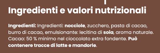 Nocciole, zucchero, pasta di cacao, burro di cacao, emulsionante: lecitina di soia, aroma naturale. Cacao: 50 % minimo nel cioccolato extra fondente. Può contenere tracce di latte e mandorle.