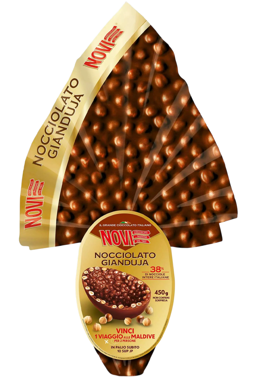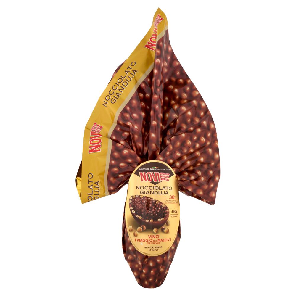 Uovo di Pasqua Novi da 450g al cioccolato gianduja con nocciole intere italiane, ideale per chi ama un gusto ricco, avvolgente e una consistenza ancora più golosa. Perfetto come idea regalo o da condividere durante le feste.