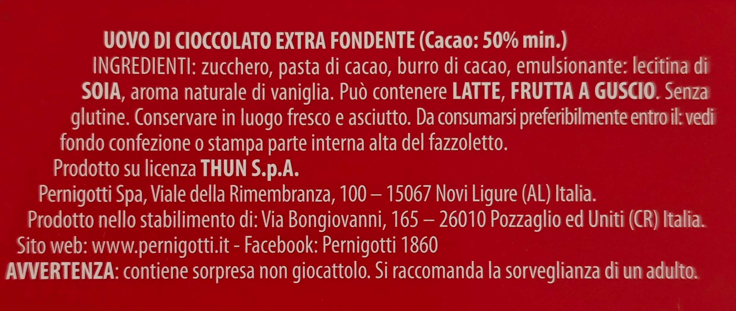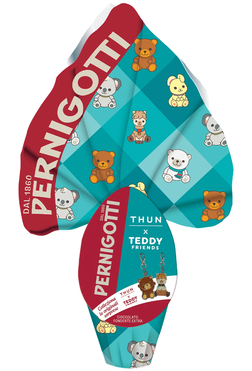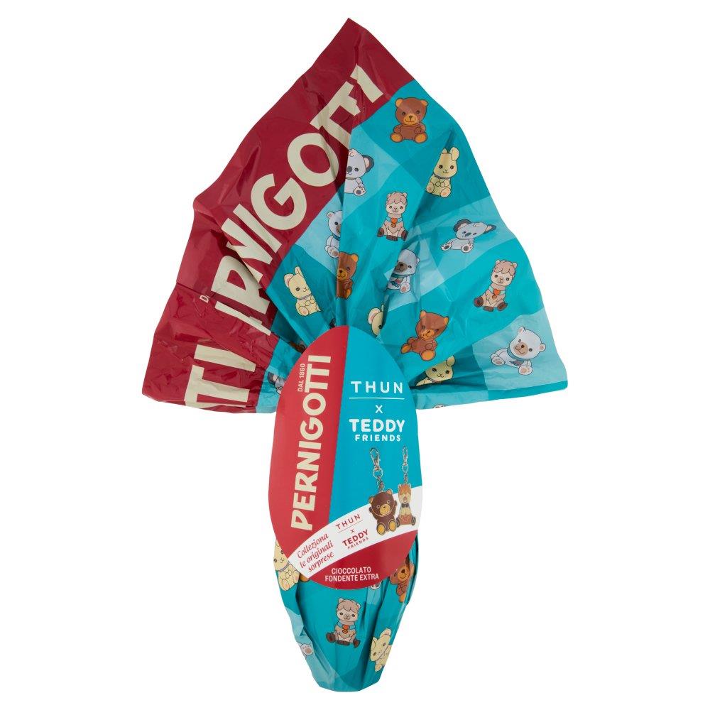 Uovo di Pasqua Pernigotti THUN da 240g al cioccolato fondente extra con almeno il 50% di cacao. Con sorpresa originale Teddy Friends all’interno. Perfetto come regalo pasquale per chi ama il fondente di qualità e le collezioni THUN.