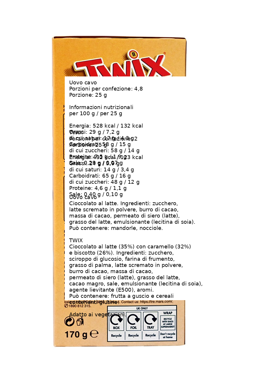 Se ami il gusto iconico delle barrette Twix, questo uovo di cioccolato rappresenta la scelta perfetta per rendere ancora più golosa qualsiasi occasione. Il Twix Uovo di Cioccolato al Latte da 170 grammi unisce la qualità del cioccolato al latte con l’esperienza unica delle celebri barrette Twix, conosciute in tutto il mondo per la combinazione irresistibile tra biscotto croccante, morbido caramello e cioccolato al latte. All’interno della confezione trovi un uovo di cioccolato al latte dalla consistenza cremosa e dal gusto avvolgente, ideale da condividere con amici e familiari oppure da gustare nei momenti di pausa e relax. A rendere questo prodotto ancora più speciale sono le barrette Twix incluse nella confezione, che offrono il classico equilibrio tra croccantezza e dolcezza che ha reso questo snack uno dei più amati a livello internazionale. Ogni assaggio offre un mix perfetto tra il gusto intenso del cioccolato, la consistenza friabile del biscotto e la morbidezza del caramello, creando un’esperienza di gusto completa e appagante. Questo uovo di cioccolato è ideale come regalo di Pasqua, come dolce sorpresa per bambini e adulti oppure semplicemente per chi desidera concedersi un momento di puro piacere con uno dei marchi più famosi nel mondo della confetteria. Grazie alla qualità garantita dal marchio Twix, appartenente al gruppo Mars, questo prodotto rappresenta un perfetto equilibrio tra tradizione, gusto e divertimento.