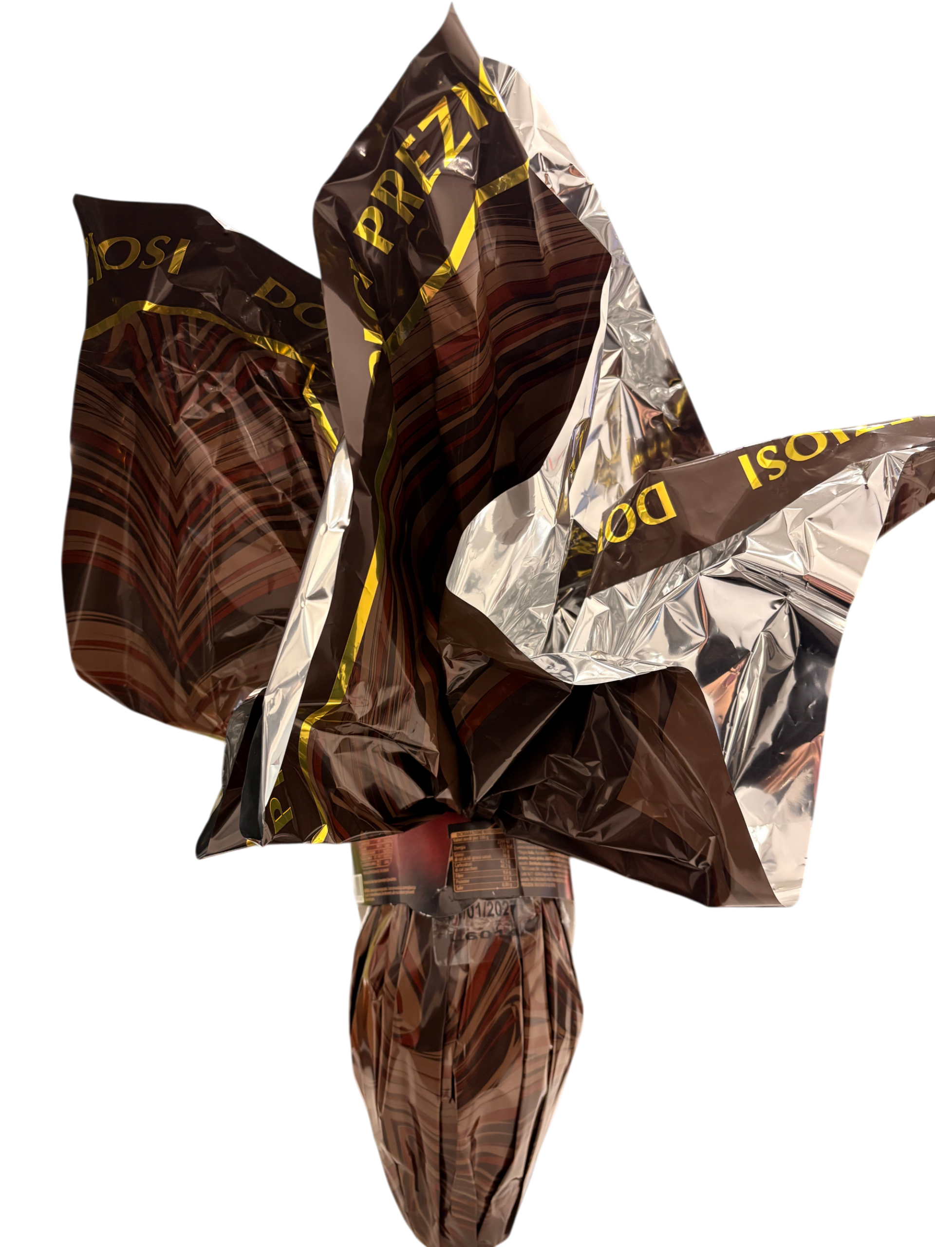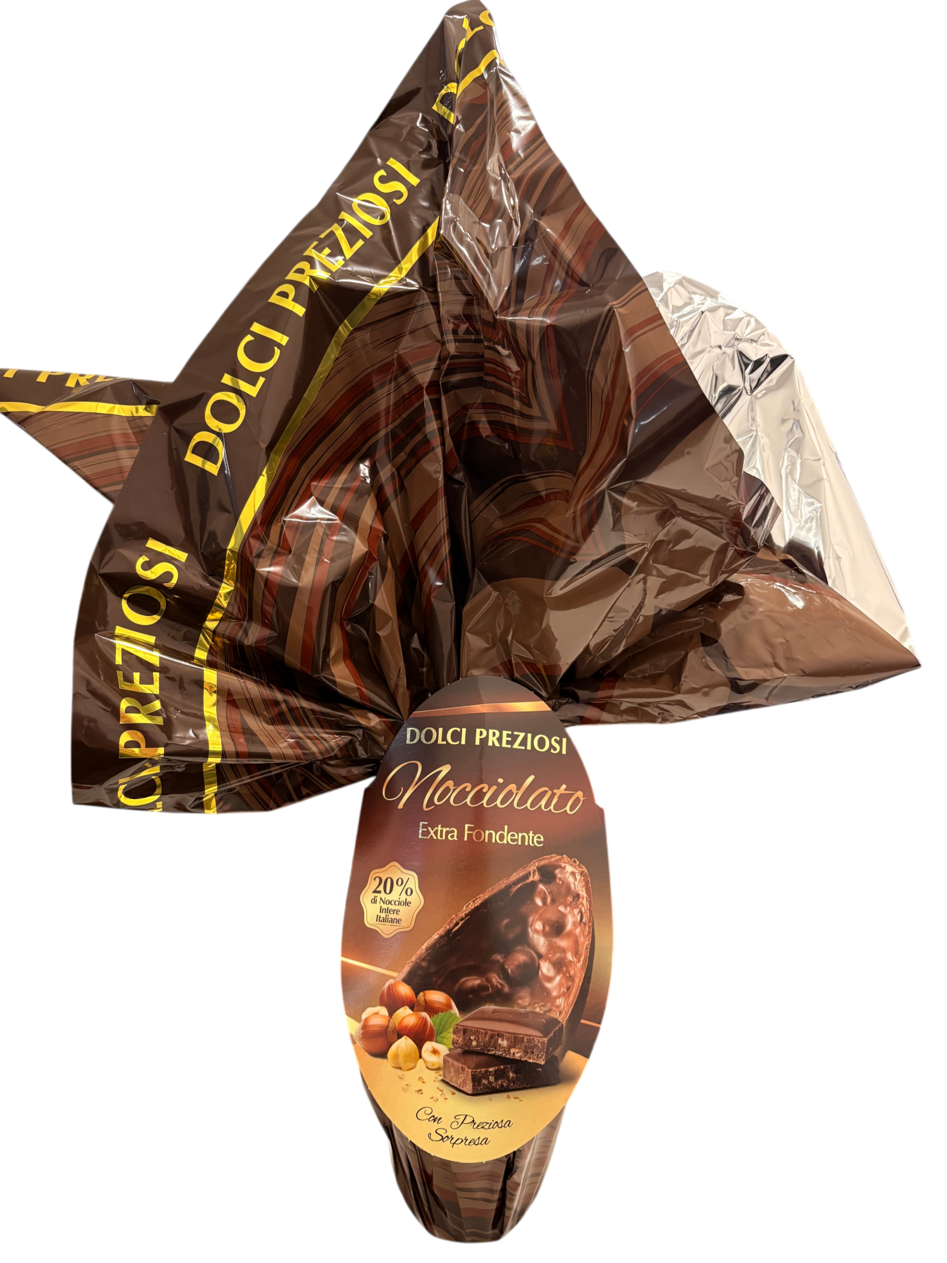 Uovo di Pasqua Dolci Preziosi Nocciolato Extra Fondente da 400g con croccanti nocciole intere e sorpresa inclusa. Il gusto intenso del cioccolato fondente incontra la croccantezza delle nocciole per un’esperienza di gusto ricca e avvolgente, perfetta da regalare o condividere durante le festività pasquali.