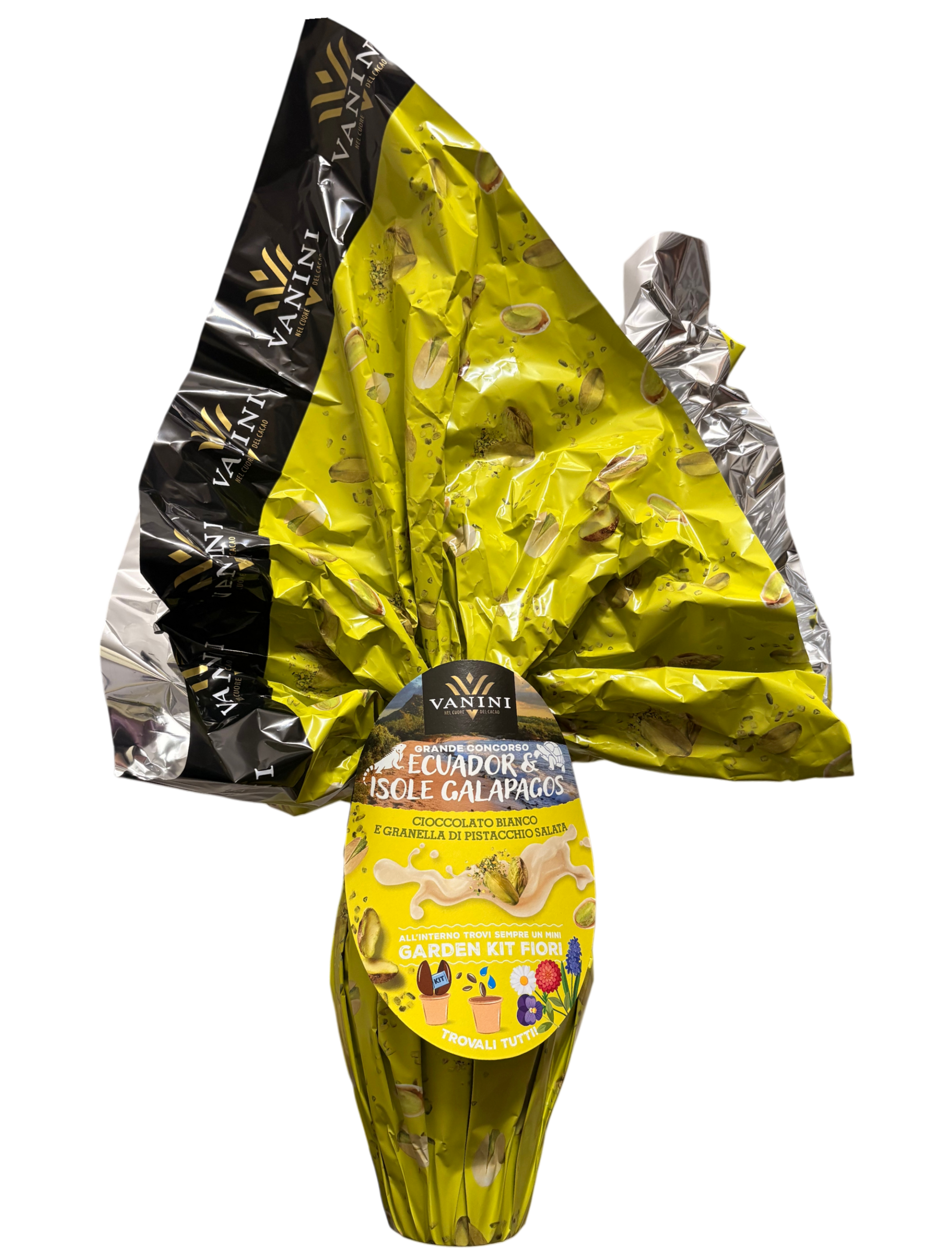 Scopri la magia dell’ Ecuador e delle Isole Galapagos con questo lussuoso uovo di Pasqua Vanini da 280g. Un’esperienza di gusto unica che unisce il pregiato cioccolato bianco e la croccantezza della granella pistacchio salata. La confezione, caratterizzata da un elegante design in verde, presenta una deliziosa decorazione con pistacchi interi e sbriciolati. All’interno dell’uovo, troverai una sorpresa speciale: un kit mini orto per coltivare le tue erbe aromatiche.