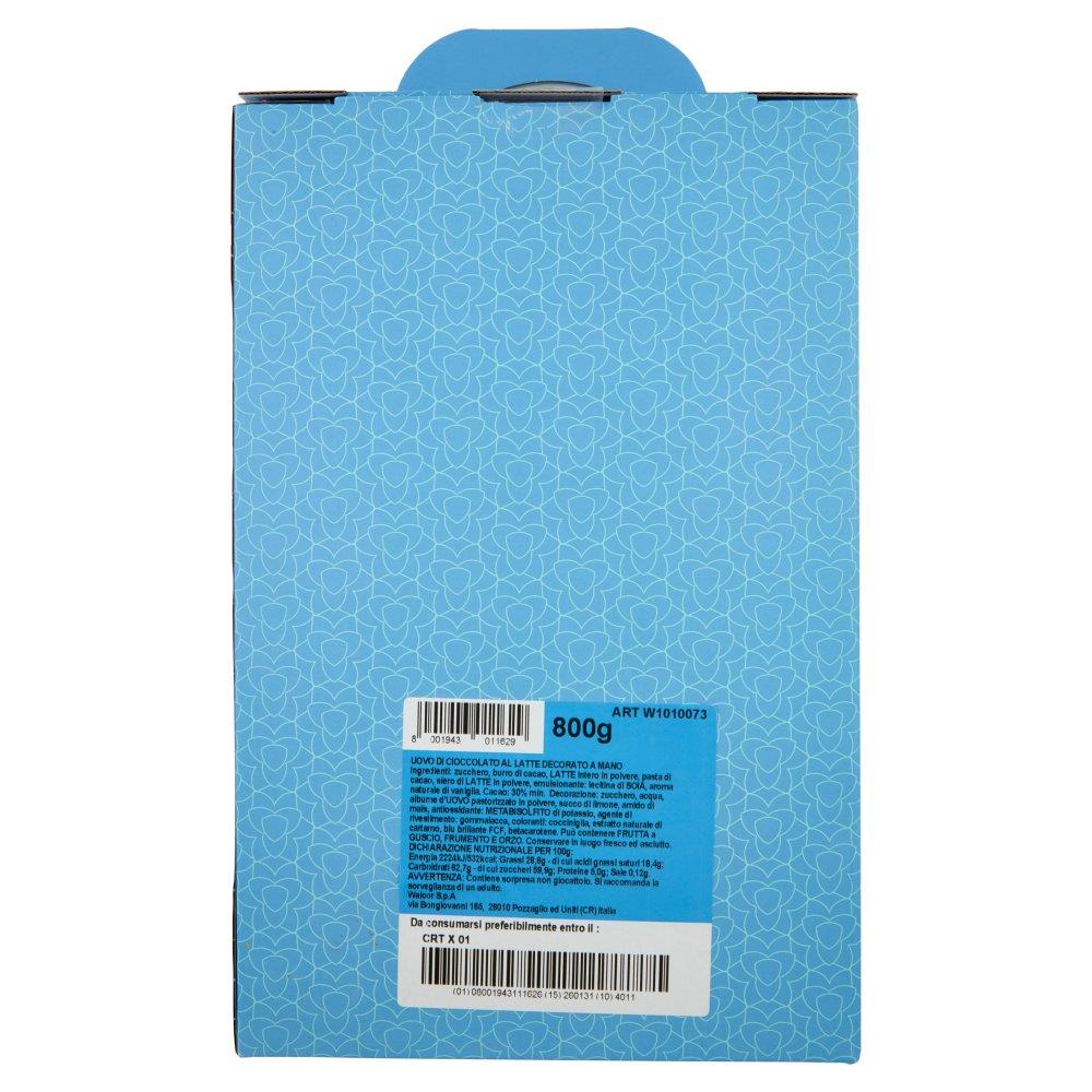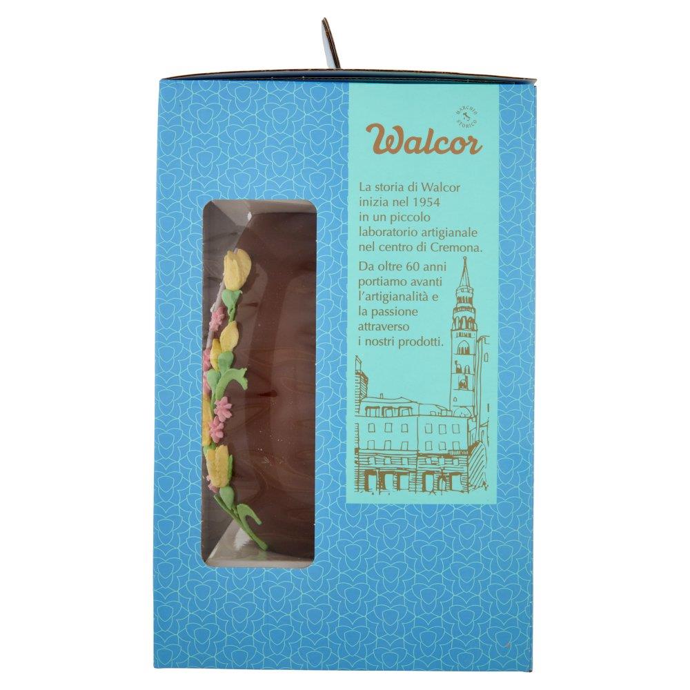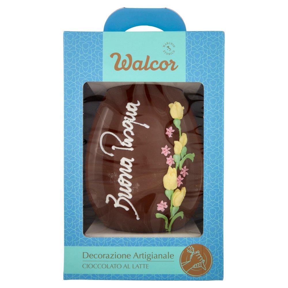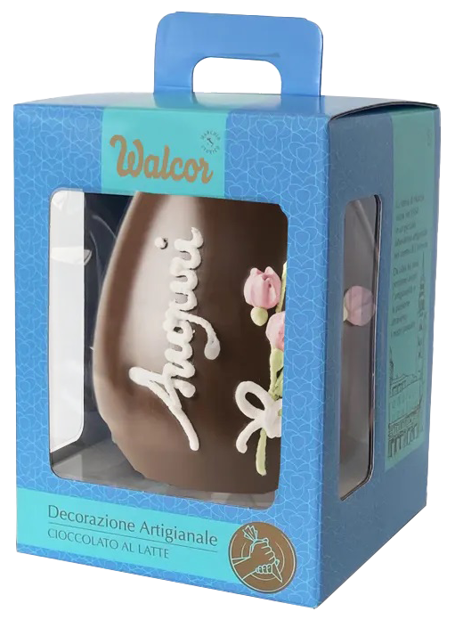 Maxi uovo di Pasqua Walcor da 800g in cioccolato al latte, decorato a mano con decorazioni artigianali assortite (scelta casuale). Regalo elegante e scenografico, ideale per la tavola di Pasqua o per un dono importante e goloso.