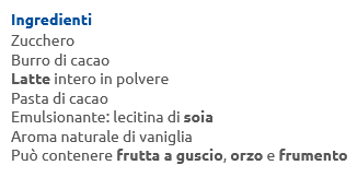Ingredienti: zucchero, burro di cacao, latte intero in polvere, pasta di cacao, emulsionante: lecitina di soia, aroma naturale di vaniglia. Può contenere frutta a guscio, orzo e frumento. Conservare in fuogo fresco ed asciutto.