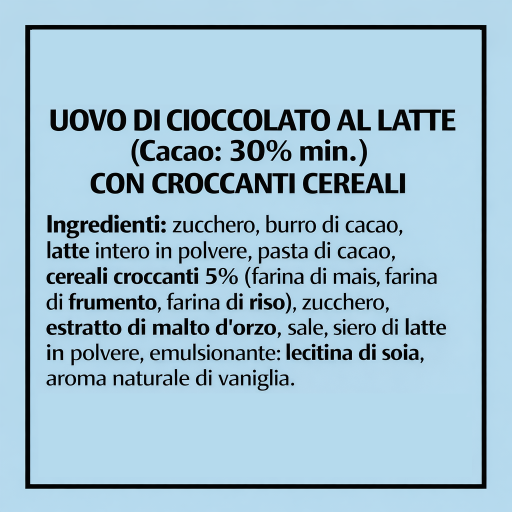 Zucchero, Burro di cacao, Latte intero in polvere, Pasta di cacao, Cereali croccanti 5% (farina di mais, farina di frumento, farina di riso, zucchero, estratto di malto d’orzo, sale), Siero di latte in polvere, Emulsionante: lecitine di soia, Aroma naturale di vaniglia. Può contenere frutta a guscio e senape