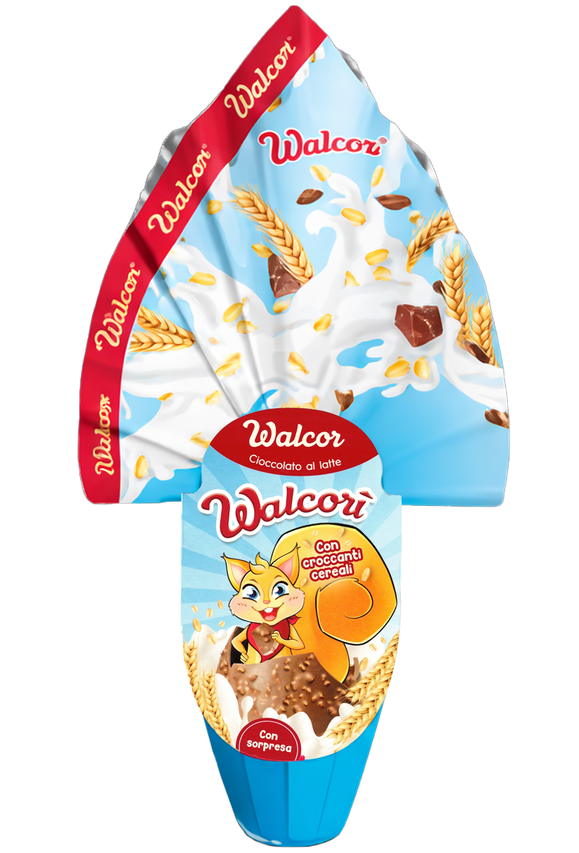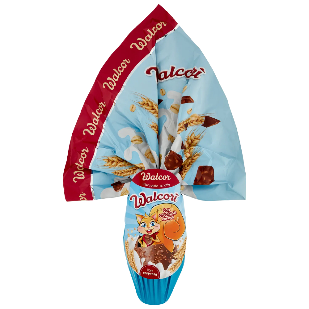 Uovo di Pasqua Walcor Walcorì da 170g in cioccolato al latte con cacao minimo 30%, arricchito con croccanti cereali per una texture irresistibile. Contiene una sorpresa all’interno, ideale come regalo pasquale per bambini e perfetto per unire gusto, tradizione e divertimento.