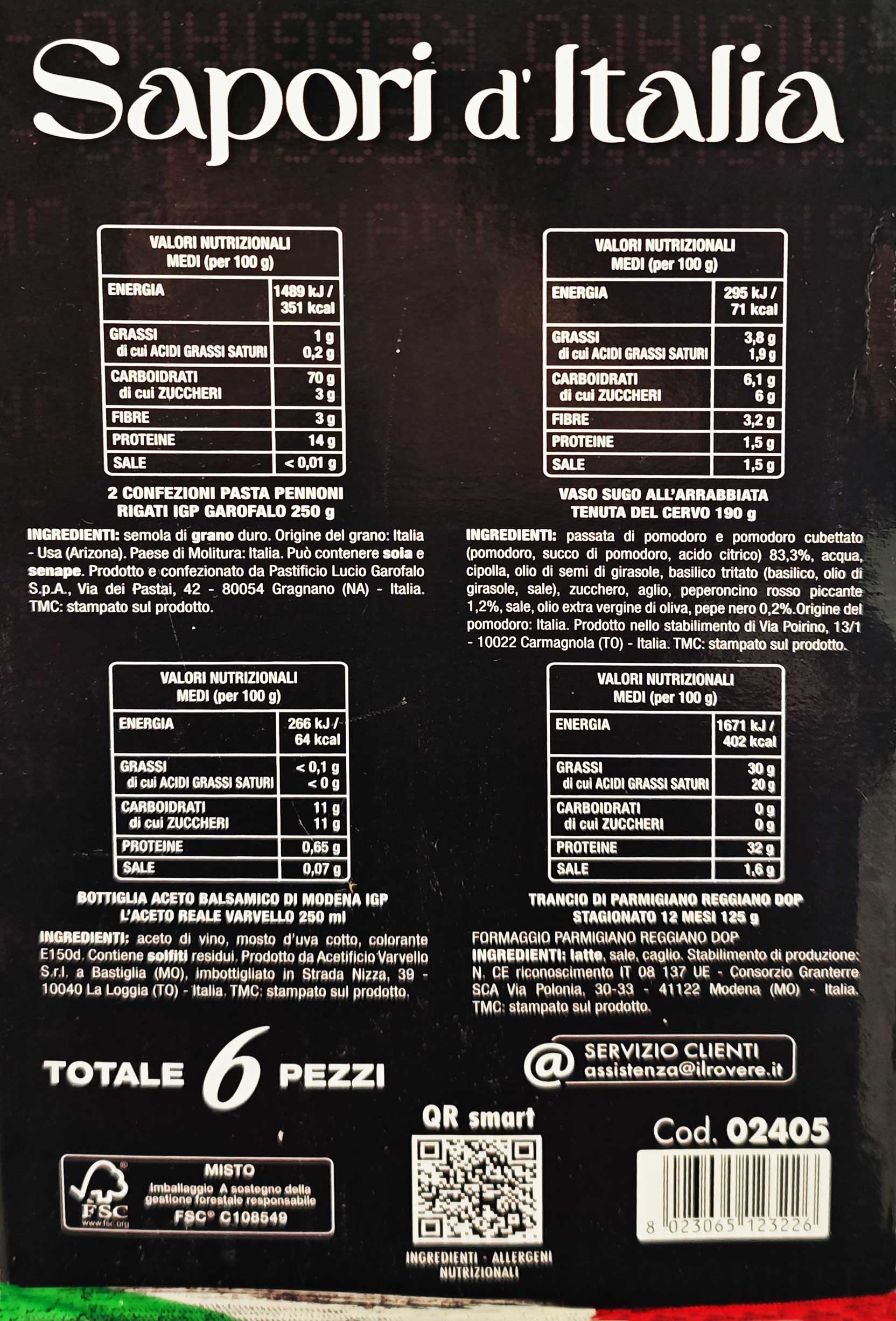 Scopri l’autentico sapore dell’Italia con questa elegante confezione regalo che racchiude il meglio della tradizione gastronomica italiana. Il set comprende 6 pezzi accuratamente selezionati: un prezioso trancio di Parmigiano Reggiano DOP stagionato 12 mesi (125g), due confezioni di pasta pennoni rigati IGP Garofalo (250g ciascuna), una bottiglia di aceto balsamico di Modena IGP L’Aceto Reale Varvello (250 ml), un vaso di sugo all’arrabbiata Tenuta del Cervo (190g) e un mini ricettario del Consorzio del Parmigiano Reggiano. Ogni ingrediente è stato scelto per garantire un’esperienza culinaria autentica e di alta qualità. La pasta è prodotta con semola di grano duro di origine italiana e americana, mentre il Parmigiano Reggiano DOP rappresenta l’eccellenza casearia italiana. Il sugo all’arrabbiata è preparato con pomodori italiani selezionati e il pregiato aceto balsamico di Modena completa questa straordinaria selezione. Una confezione regalo perfetta per gli amanti della cucina italiana