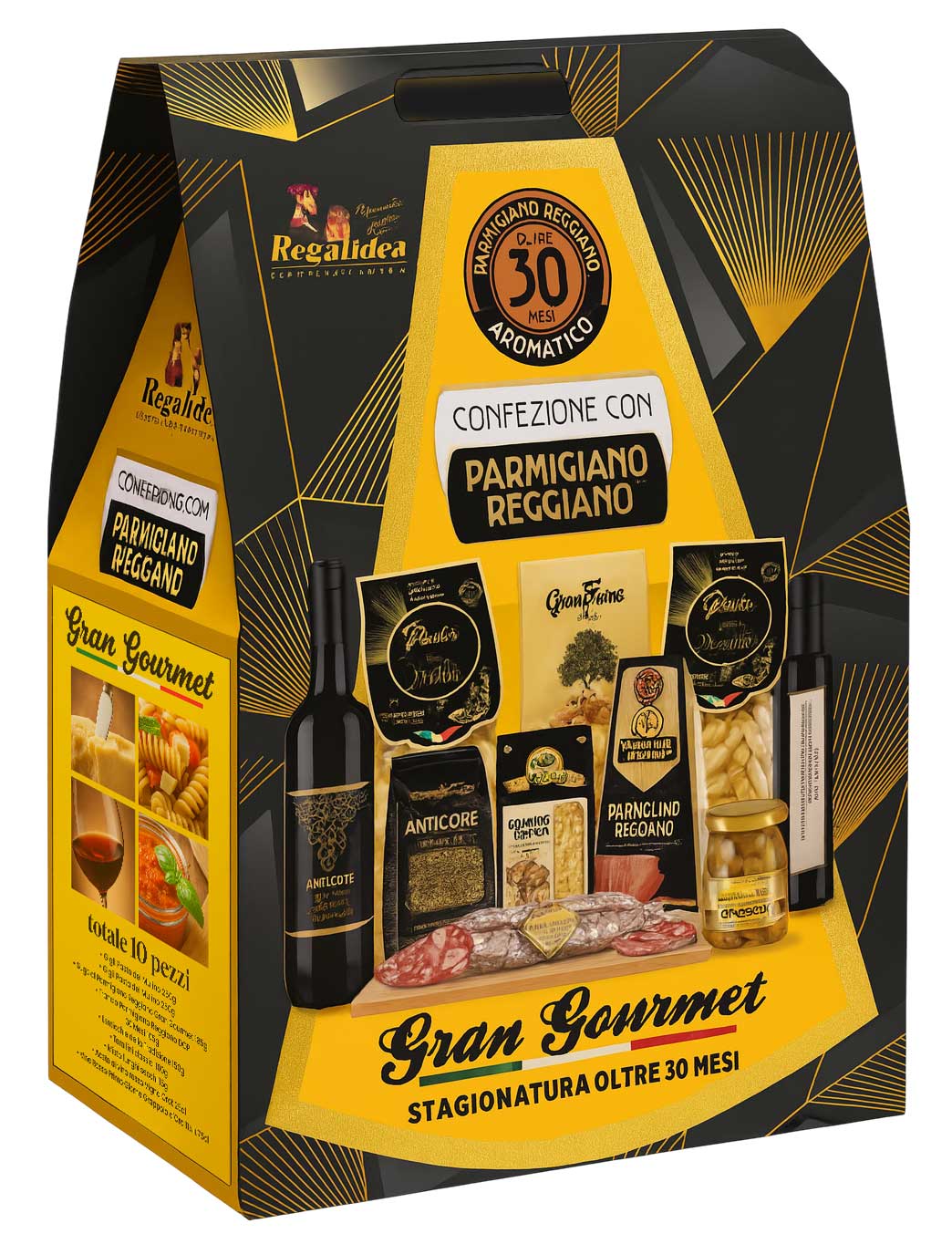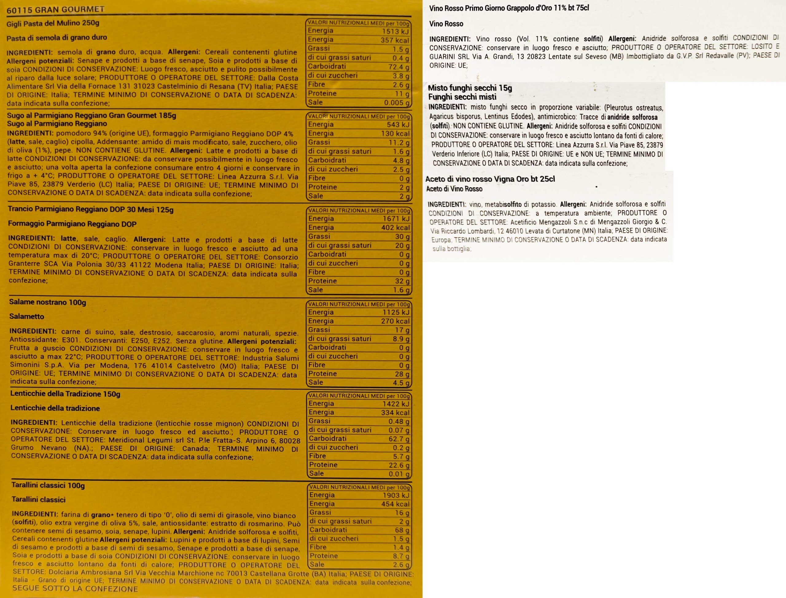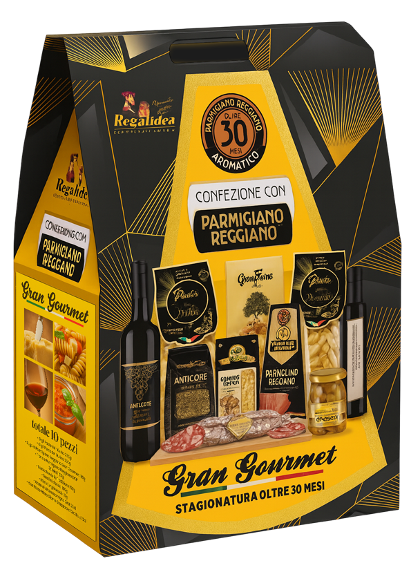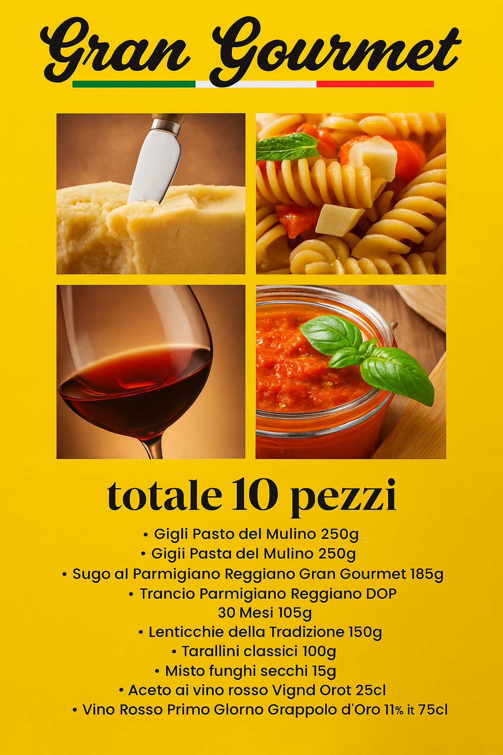Scopri l’eccellenza della gastronomia italiana con questa lussuosa valigetta regalo ‘Gran Gourmet’ contenente 10 prelibatezze selezionate. Il set include due confezioni di pasta artigianale Gigli del Mulino (250g ciascuna), un delizioso sugo al Parmigiano Reggiano (185g), un pregiato trancio di Parmigiano Reggiano DOP stagionato 30 mesi (105g), e l’autentico salame nostrano. Per arricchire ulteriormente l’esperienza culinaria, troverai le tradizionali lenticchie (150g), croccanti tarallini classici (100g), un raffinato mix di funghi secchi (15g), aceto di vino rosso della Vigna d’Oro (25cl) e una bottiglia di vino rosso Primo Giorno Grappolo d’Oro (75cl, 11%). Questa elegante confezione rappresenta un viaggio attraverso i sapori più autentici della tradizione italiana, perfetta come regalo per gli amanti della buona cucina o per creare un’indimenticabile esperienza gastronomica. Ogni prodotto è stato accuratamente selezionato per garantire la massima qualità e genuinità.