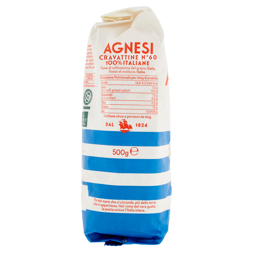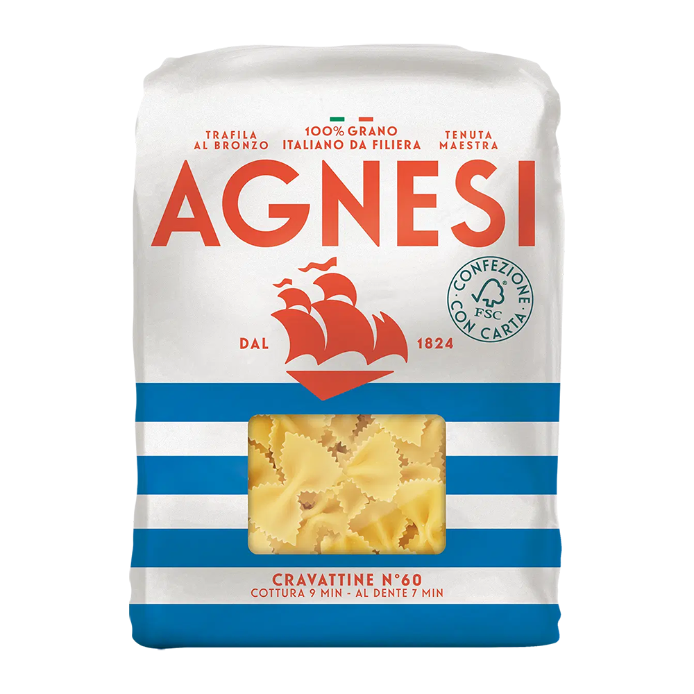 Scopri la pasta Agnesi Cravattine n°60, un’eccellenza italiana realizzata con semola di grano duro di alta qualità. Confezionata in un elegante sacchetto a righe blu e bianche, questa pasta da 500g è perfetta per creare piatti gustosi e autentici!