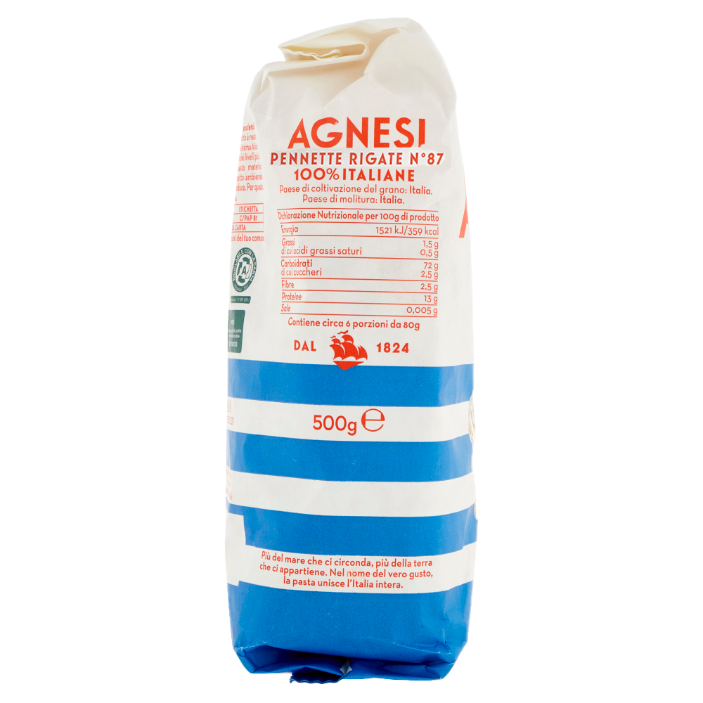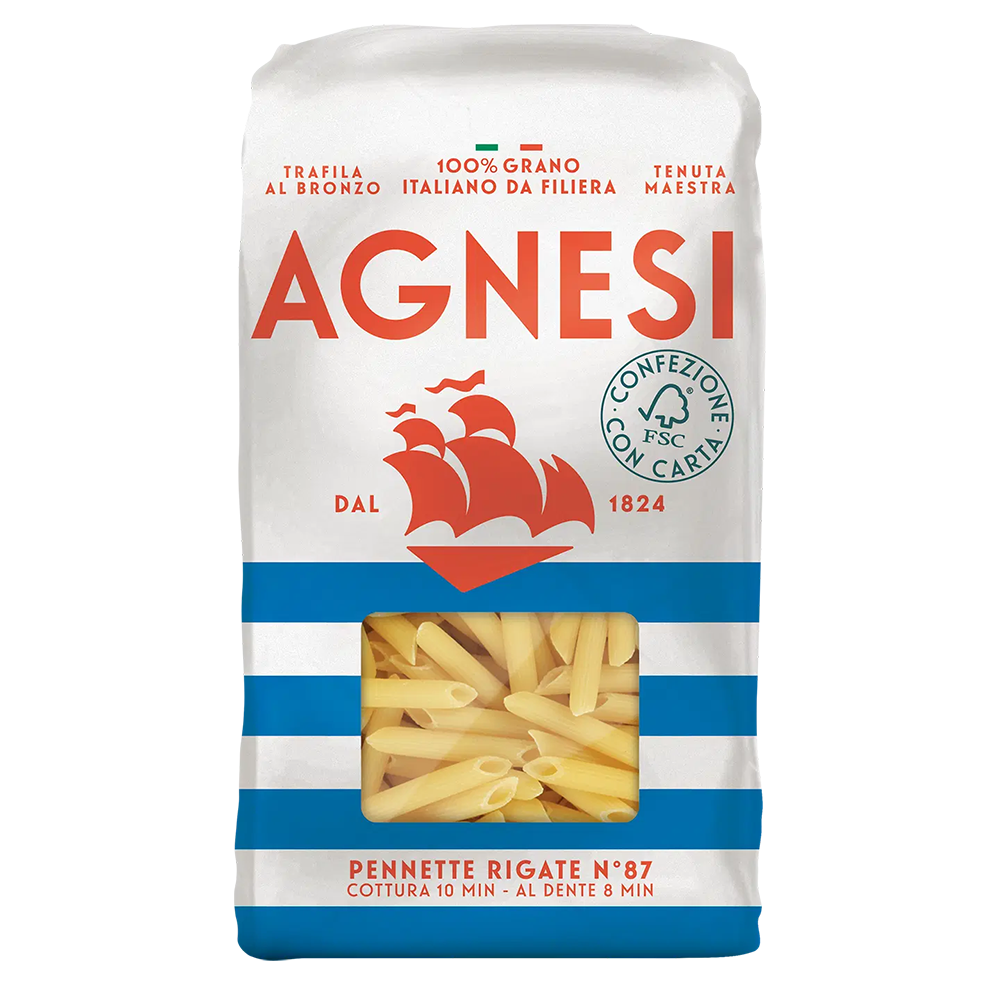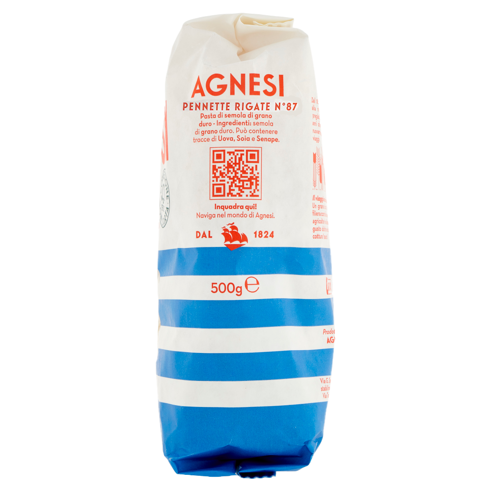 Scopri la qualità superiore della pasta Agnesi Pennette Rigate n°87, realizzata con semola di grano duro e trafilata al bronzo per una consistenza perfetta. Questo formato versatile da 500g è ideale per una varietà di piatti, dalle ricette tradizionali a quelle più innovative!