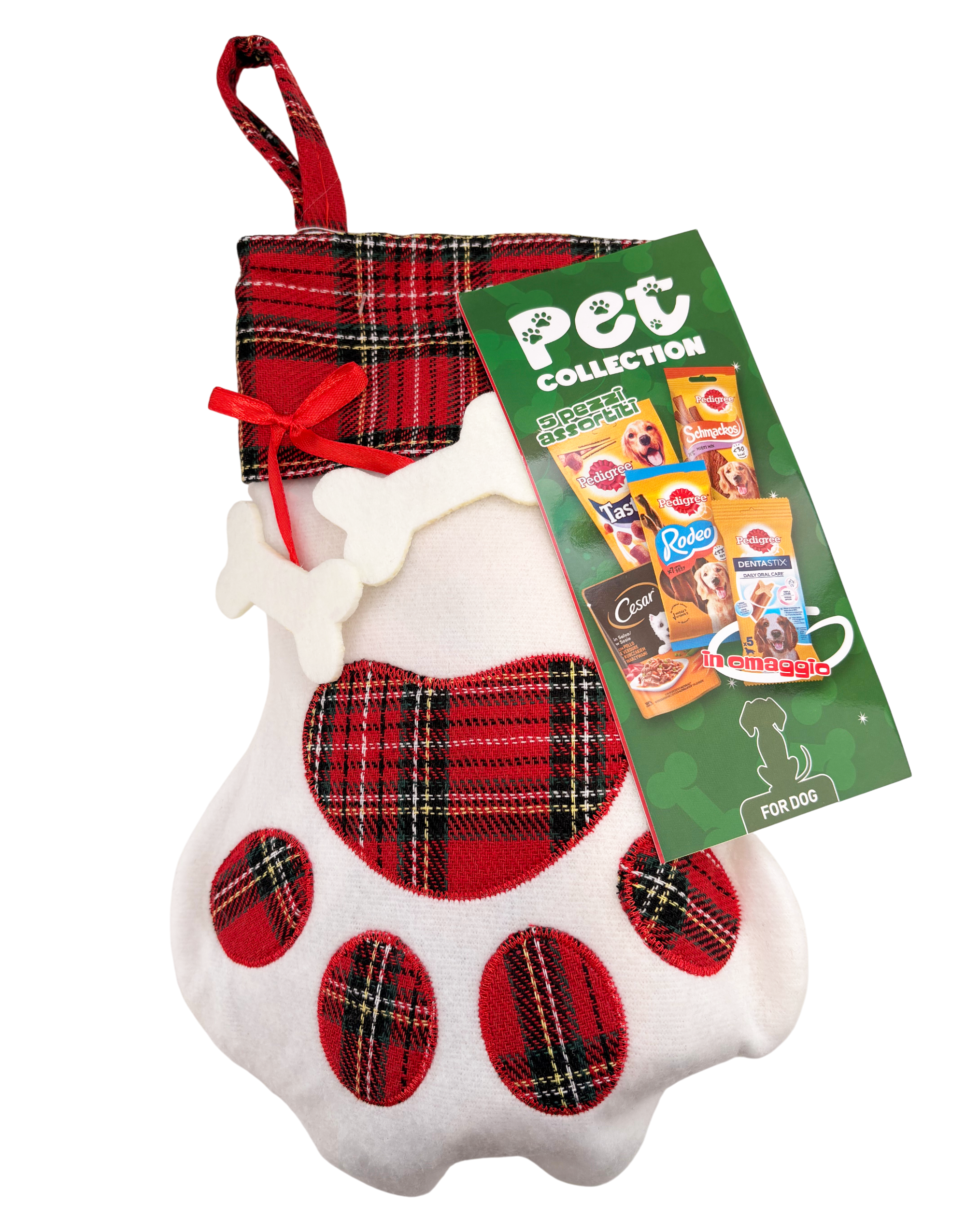 Questa simpatica calza della Befana per cani è perfetta per celebrare l’Epifania anche con il tuo amico a quattro zampe! Realizzata in morbido tessuto bianco con dettagli in tartan rosso e nero a forma di impronta, è decorata con un elegante fiocchetto rosso e due ossicini applicati, rendendola un accessorio festivo e adorabile. All’interno contiene una selezione di snack assortiti per cani, provenienti dalla Pet Collection, con marchi come Pedigree, Cesar e altri gustosi premi. È un’idea regalo ideale per coccolare il tuo cane con uno snack speciale durante le feste. Perfetta da appendere al camino o sotto l’albero, unisce estetica natalizia e gusto, per rendere la Befana un momento ancora più dolce… anche per il tuo cane!