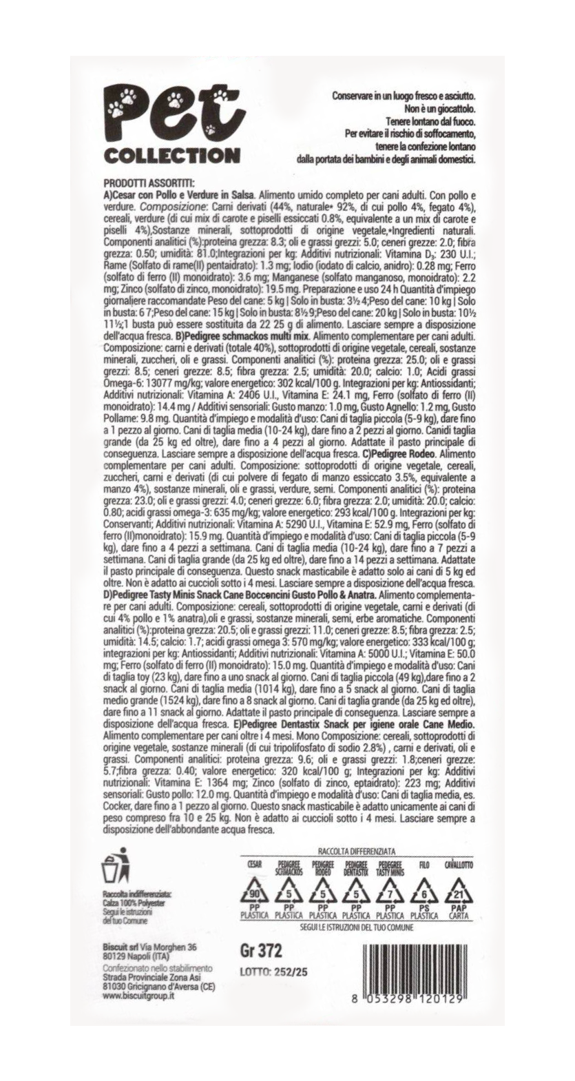 Ingredienti: A)Cesar con Pollo e Verdure in Salsa. Alimento umido completo per cani adulti. Con pollo e verdure. Composizione: Carni derivati (44%, naturale 92%, di cui polio 4%, fegato 4%), cereali, verdure (di cui mix di carote e piselli essiccati 0.8%, equivalente a un mix di carote e piselli 4%),Sostanze minerali, sottoprodotti di origine vegetale, Ingredienti naturali. Componenti analitici (%):proteina grezza: 8.3; oli e grassi grezzi: 5.0; ceneri grezze: 2.0; fibra grezza: 0.50; umidità: 81.0;Integrazioni per kg: Additivi nutrizionali: Vitamina D,: 230 U.I.; Rame (Solfato di rame(II) pentaidrato): 1.3 mg; lodio (iodato di calcio, anidro): 0.28 mg; Ferro (solfato di ferro (II) monoidrato): 3.6 mg; Manganese (solfato manganoso, monoidrato): 2.2 mg; Zinco (solfato di zinco, monoidrato): 19.5 mg. Preparazione e uso 24 h Quantità d’impiego giornaliere raccomandate Peso del cane: 5 kg | Solo in busta: 31⁄2 4;Peso del cane: 10 kg | Solo in busta: 67;Peso del cane: 15 kg | Solo in busta: 829;Peso del cane: 20 kg | Solo in busta: 101⁄2 11/1 busta può essere sostituita da 22 25 g di alimento. Lasciare sempre a disposizione dell’acqua fresca. B)Pedigree schmackos multi mix. Alimento complementare per cani adulti. Composizione: carni e derivati (totale 40%), sottoprodotti di origine vegetale, cereali, sostanze minerali, zuccheri, oli e grassi. Componenti analitici (%): proteina grezza: 25.0; oli e grassi grezzi: 8.5; ceneri grezze: 8.5; fibra grezza: 2.5; umidità: 20.0; calcio: 1.0; Acidi grassi Omega-6: 13077 mg/kg; valore energetico: 302 kcal/100 g. Integrazioni per kg: Antiossidanti; Additivi nutrizionali: Vitamina A: 2406 U.I., Vitamina E: 24.1 mg, Ferro (solfato di ferro (II) monoidrato): 14.4 mg/Additivi sensoriali: Gusto manzo: 1.0 mg, Gusto Agnello: 1.2 mg, Gusto Pollame: 9.8 mg. Quantità d’impiego e modalità d’uso: Cani di taglia piccola (5-9 kg), dare fino a 1 pezzo al giorno. Cani di taglia media (10-24 kg), dare fino a 2 pezzi al giorno. Canidi taglia grande (da 25 kg ed oltre), dare fino a 4 pezzi al giorno. Adattate il pasto principale di conseguenza. Lasciare sempre a disposizione dell’acqua fresca. C)Pedigree Rodeo. Alimento complementare per cani adulti. Composizione: sottoprodotti di origine vegetale, cereali, zuccheri, carni e derivati (di cui polvere di fegato di manzo essiccato 3.5%, equivalente a manzo 4%), sostanze minerali, oli e grassi, verdure, semi. Componenti analitici (%): proteina grezza: 23.0; oli e grassi grezzi: 4.0; ceneri grezze: 6.0; fibra grezza: 2.0; umidità: 20.0; calcio: 0.80; acidi grassi omega-3: 635 mg/kg, valore energetico: 293 kcal/100 g. Integrazioni per kg: Conservanti, Additivi nutrizionali: Vitamina A: 5290 U.I., Vitamina E: 52.9 mg, Ferro (solfato di ferro (II)monoidrato): 15.9 mg. Quantità d’impiego e modalità d’uso: Cani di taglia piccola (5-9 kg), dare fino a 4 pezzi a settimana. Cani di taglia media (10-24 kg), dare fino a 7 pezzi a settimana. Cani di taglia grande (da 25 kg ed oltre), dare fino a 14 pezzi a settimana. Adattate il pasto principale di conseguenza. Questo snack masticabile è adatto solo ai cani di 5 kg ed oltre. Non è adatto ai cuccioli sotto i 4 mesi. Lasciare sempre a disposizione dell’acqua fresca. D)Pedigree Tasty Minis Snack Cane Boccencini Gusto Pollo & Anatra. Alimento complementa- re per cani adulti. Composizione: cereali, sottoprodotti di origine vegetale, carni e derivati (di cui 4% pollo e 1% anatra),oli e grassi, sostanze minerali, semi, erbe aromatiche. Componenti analitici (%) proteina grezza: 20.5; oli e grassi grezzi: 11.0; ceneri grezze: 8.5; fibra grezza: 2.5; umidità: 14.5; calcio: 1.7; acidi grassi omega 3: 570 mg/kg; valore energetico: 333 kcal/100 g: integrazioni per kg: Antiossidanti; Additivi nutrizionali: Vitamina A: 5000 U.I.; Vitamina E: 50.0 mg: Ferro (solfato di ferro (II) monoidrato): 15.0 mg. Quantità d’impiego e modalità d’uso: Cani di taglia toy (23 kg), dare fino a uno snack al giorno. Cani di taglia piccola (49 kg),dare fino a 2 snack al giorno. Cani di taglia media (1014 kg), dare fino a 5 snack al giorno. Cani di taglia medio grande (1524 kg), dare fino a 8 snack al giorno. Cani di taglia grande (da 25 kg ed oltre), dare fino a 11 snack al giorno. Adattate il pasto principale di conseguenza. Lasciare sempre a disposizione dell’acqua fresca. E)Pedigree Dentastix Snack per igiene orale Cane Medio. Alimento complementare per cani oltre i 4 mesi. Mono Composizione: cereali, sottoprodotti di origine vegetale, sostanze minerali (di cui tripolifosfato di sodio 2.8%), carni e derivati, oli e grassi. Componenti analitici: proteina grezza: 9.6; oli e grassi grezzi: 1.8;ceneri grezze: 5.7,fibra grezza: 0.40; valore energetico: 320 kcal/100 g: Integrazioni per kg: Additivi nutrizionali: Vitamina E: 1364 mg; Zinco (solfato di zinco, eptaidrato): 223 mg; Additivi sensoriali: Gusto pollo: 12.0 mg. Quantità d’impiego e modalità d’uso: Cani di taglia media, es. Cocker, dare fino a 1 pezzo al giorno. Questo snack masticabile è adatto unicamente ai cani di peso compreso fra 10 e 25 kg. Non è adatto ai cuccioli sotto i 4 mesi. Lasciare sempre a disposizione dell’abbondante acqua fresca.